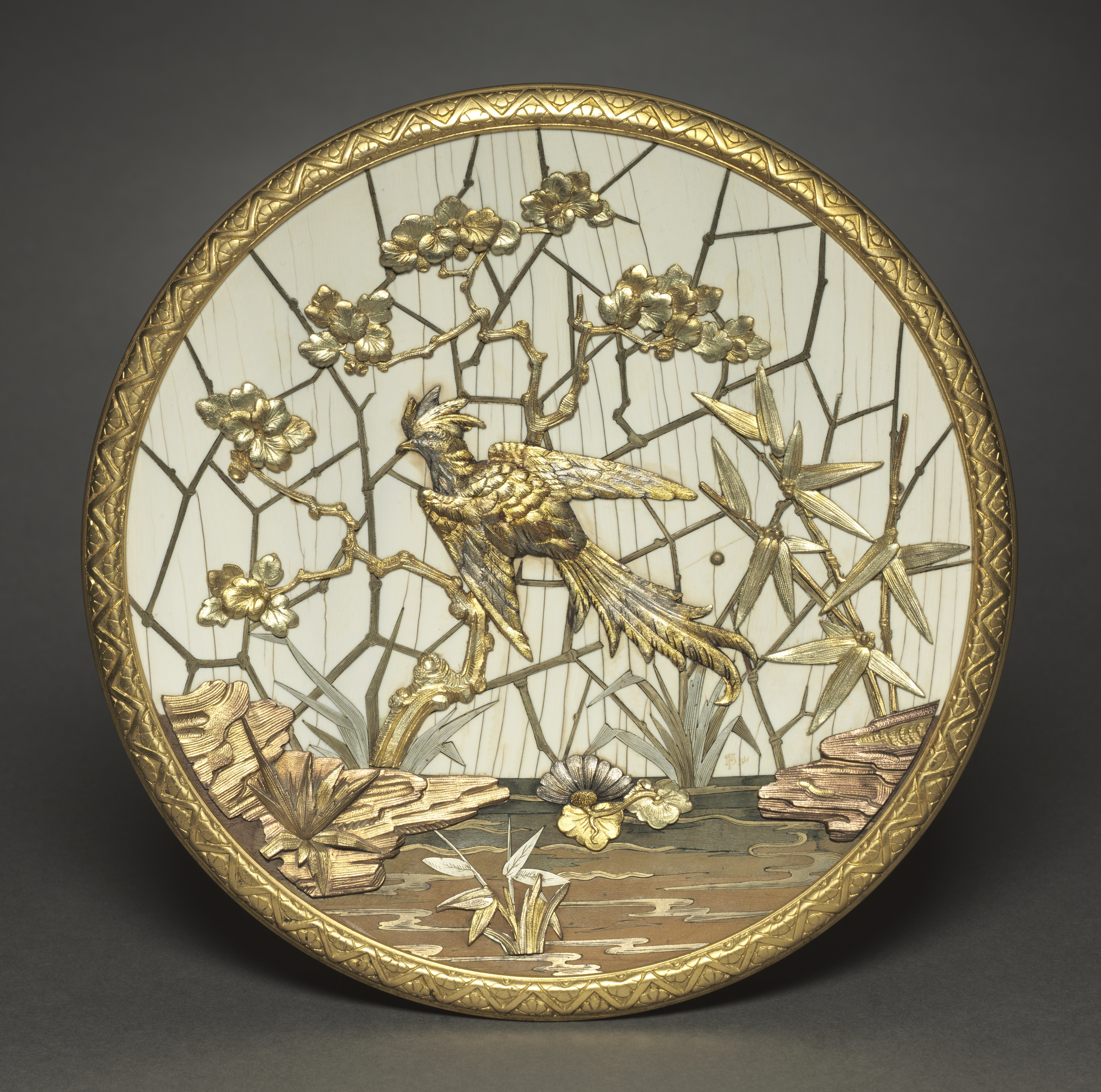 Round plaque with a gold border. The plaque is white with a geometric pattern of intersecting black lines. A gold bird perches on a branch with gold flowers. The bird faces left. The branch extends from the left. There are plants and flowers around the bottom. The background is dark gray. The plaque appears to be titled "Plaque" and attributed to "Veuve Ferdinand Duvinage".