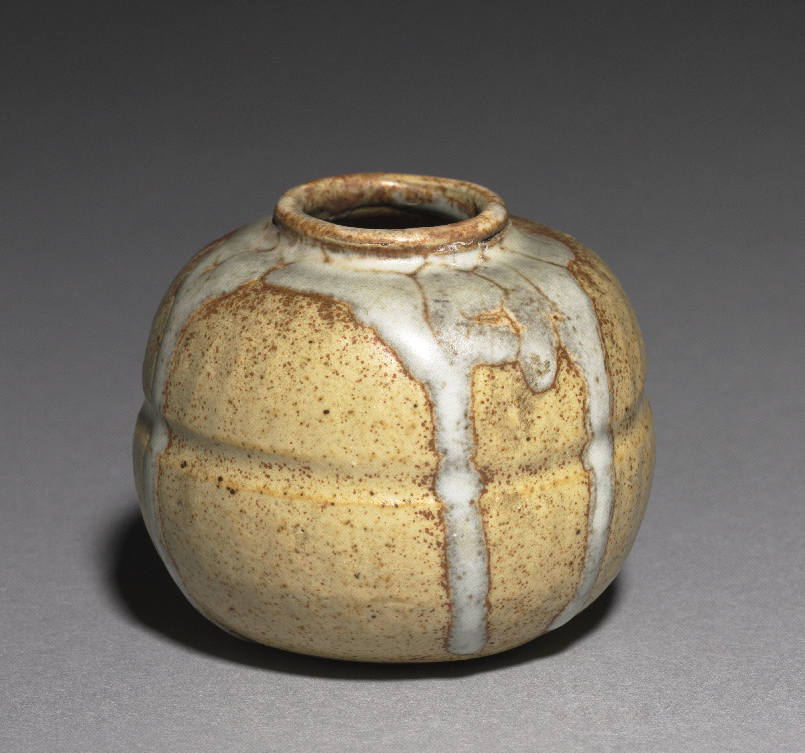 Small Pot by Georges Hoentschel. A small ceramic pot with a narrow opening at the top. The pot's body is rounded and bulbous. It has a beige base color with brown speckles and white glaze that has dripped down its sides in several uneven streaks. The white glaze also covers parts of the pot's body in irregular patches. The background is a plain grey color.