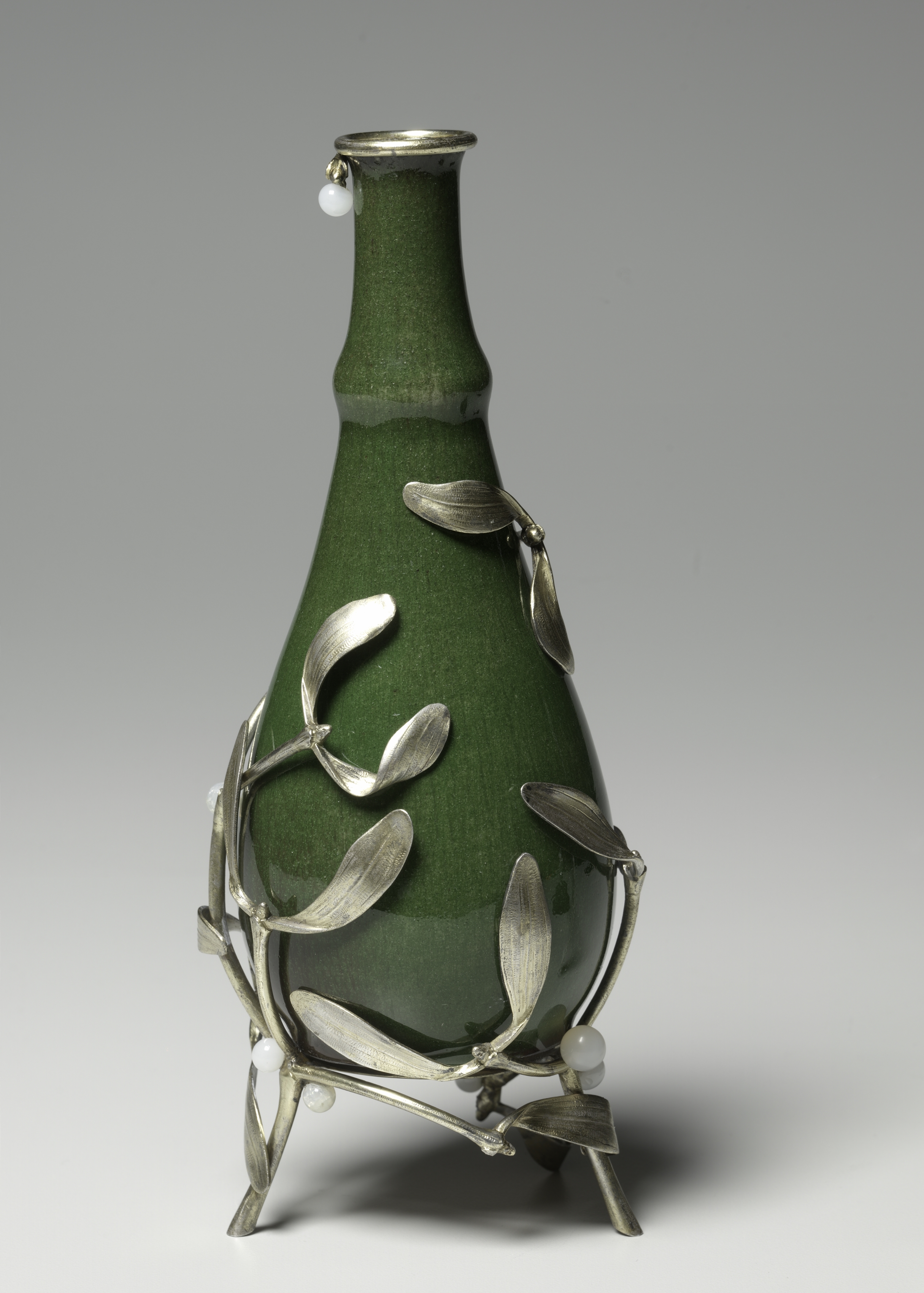 Green vase with a narrow neck and a bulbous body. The vase has a shiny glaze. It is decorated with a metal stand and metal leaves. The metal stand has three legs and is shaped like a vine with leaves. The metal leaves are attached to the vase and the stand. The vase has a small lip at the top. The background is gray.