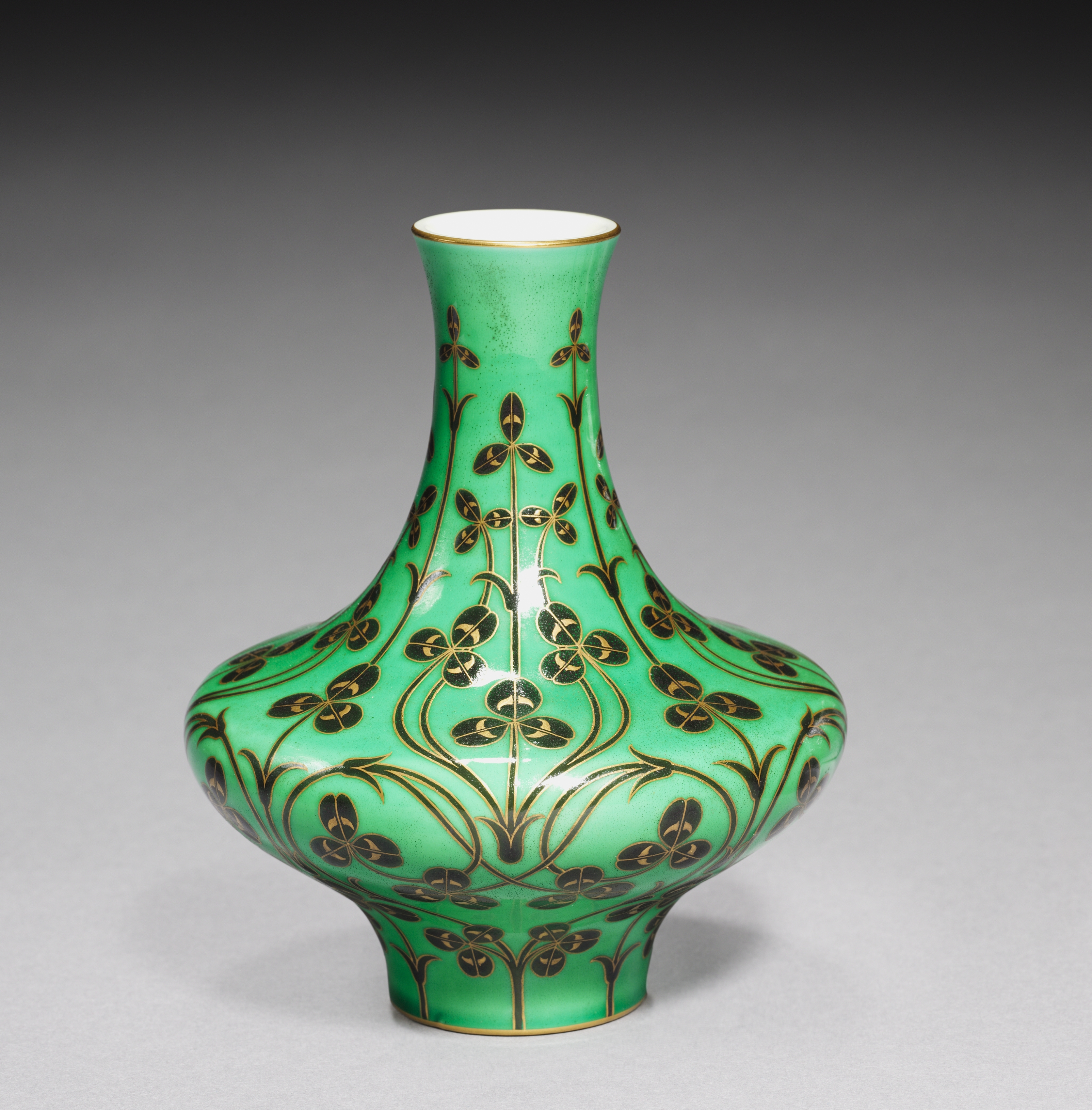 Green vase with black and gold floral design by Henri-Louis-Laurent Ulrich. The vase has a bulbous body with a narrow neck and a wide mouth. The body is primarily green with a black and gold floral pattern. The floral design features stems with leaves and flowers. The rim of the vase has a gold trim. The inside of the vase is white. The background is a gradient from dark gray to light gray. The vase has a glossy finish. It is symmetrical and centered in the image.