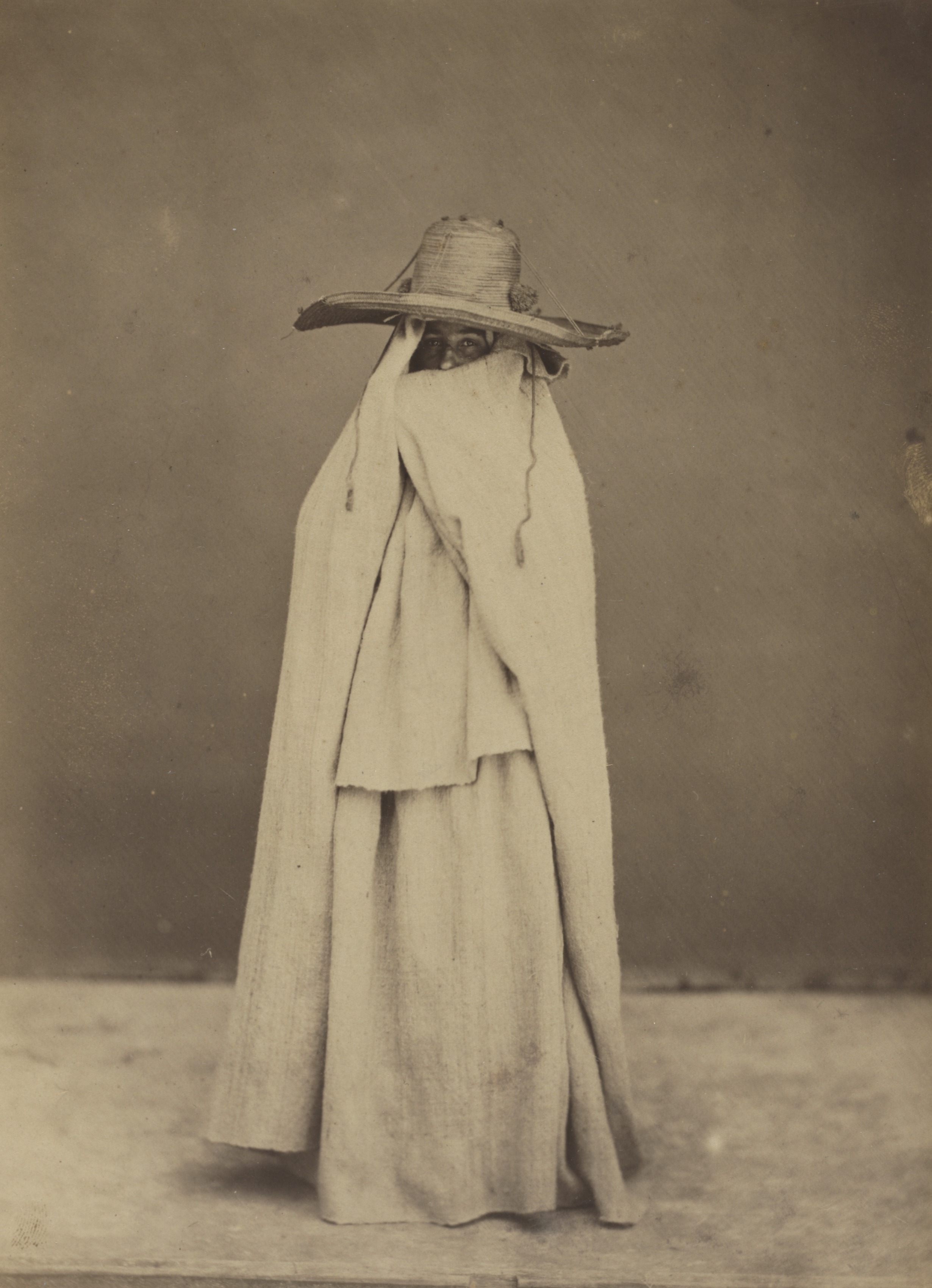 Sepia-toned photograph of a woman wearing a long, light-colored robe or dress and a wide-brimmed hat. The woman's face is mostly covered by a cloth or veil that drapes down from the hat. She stands on a flat surface against a plain background. The image is by Gustave de Beaucorps and titled "Algerian Woman".