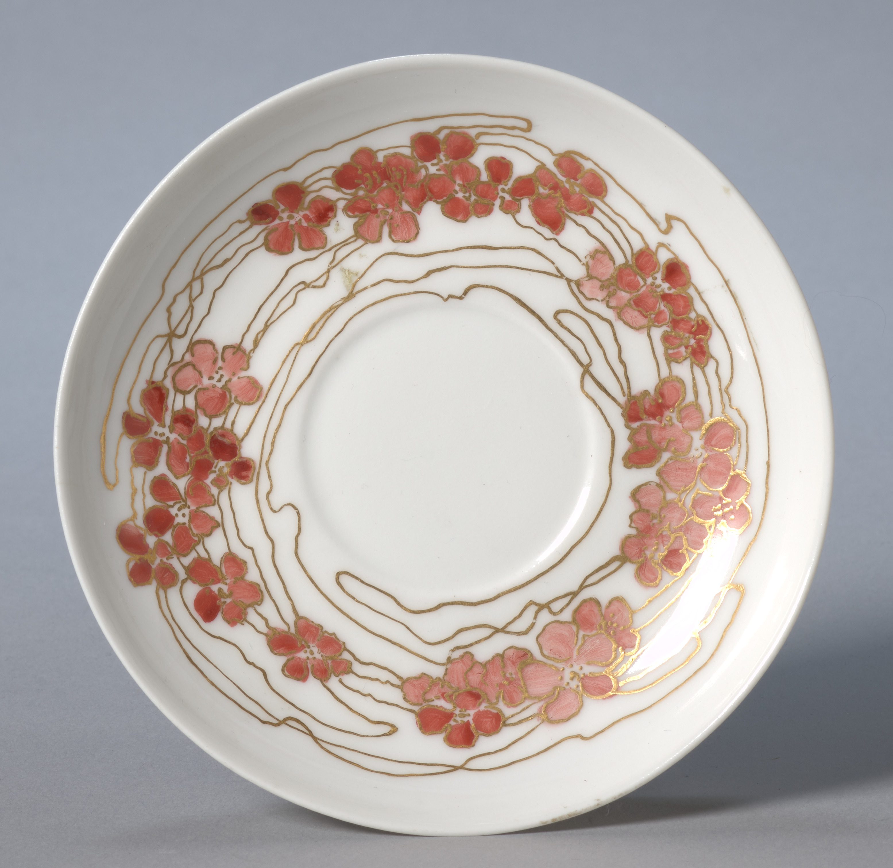 White saucer with a wide rim and a circular indentation in the center. The saucer features a design of pink flowers with gold outlines. The flowers are clustered along curved gold lines that resemble stems and branches. The background of the saucer is plain white. The saucer titled "Saucer" is by M. Louise McLaughlin.