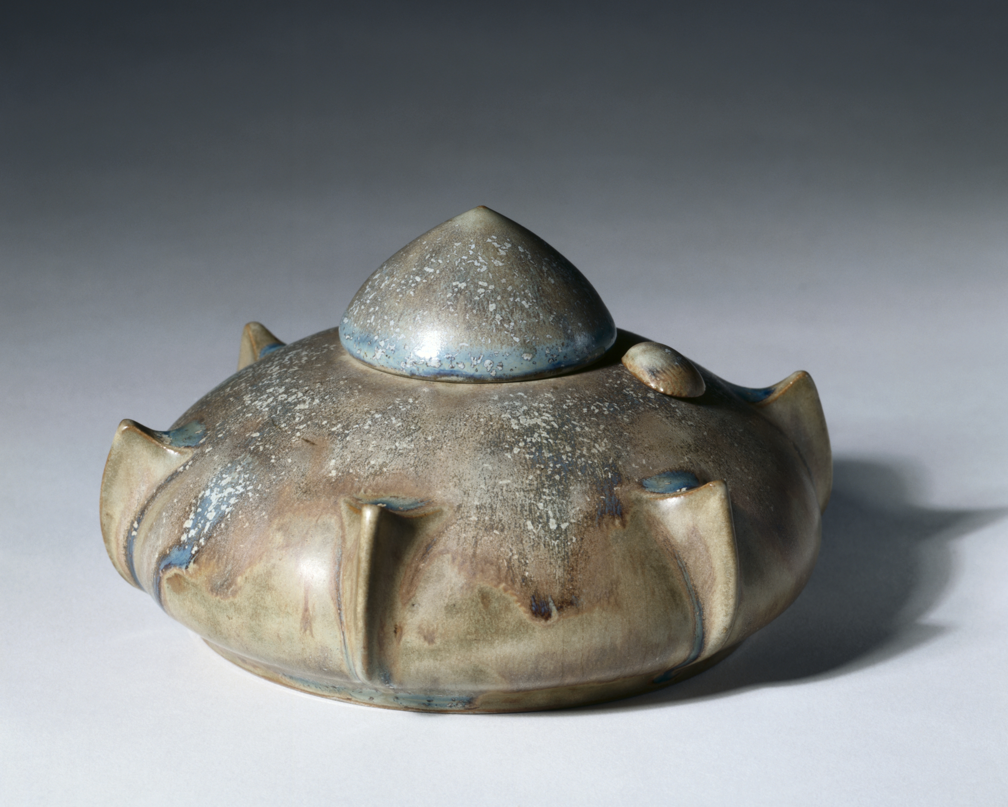 Brown ceramic inkwell with speckled white glaze and blue accents, featuring a rounded body with a recessed area and curved indentations, topped with a small conical lid. The inkwell has small protrusions on its body. The background is a gray gradient. Inkwell by Alexandre Sandier.