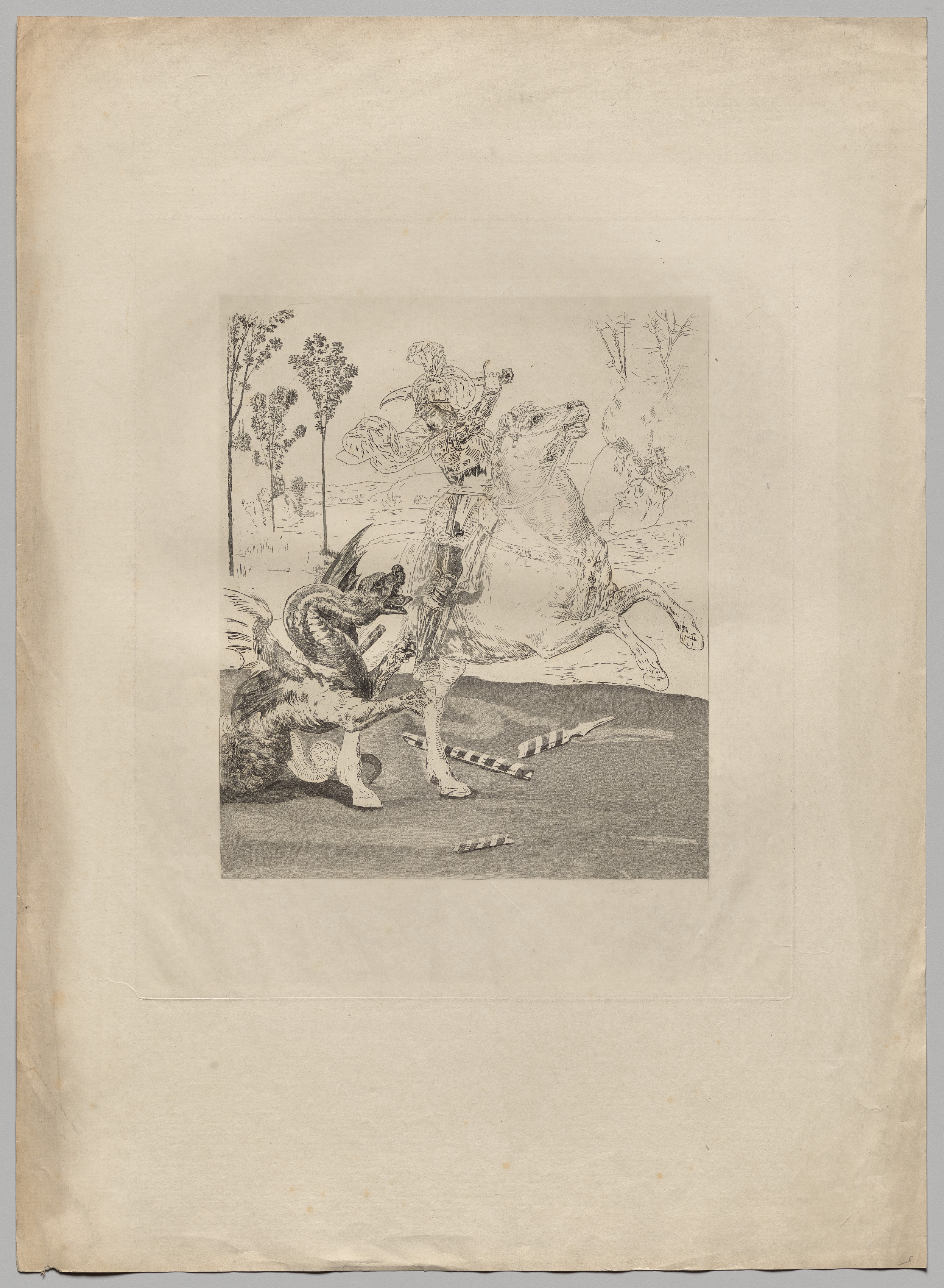 St. George and the Dragon (1) by Claude-Ferdinand Gaillard. The drawing is on a piece of aged paper with a darker rectangular area around it. The image within the rectangle depicts a man on horseback with a lance piercing a dragon. The man is wearing a hat and a tunic; he is positioned on the right side of the image. The dragon is on the left; it has a serpentine body with scales and a large head. The background includes trees and grass. The man and horse are in motion; the dragon is lying on the ground with the lance through its body. Three broken pieces of the lance lie on the ground.