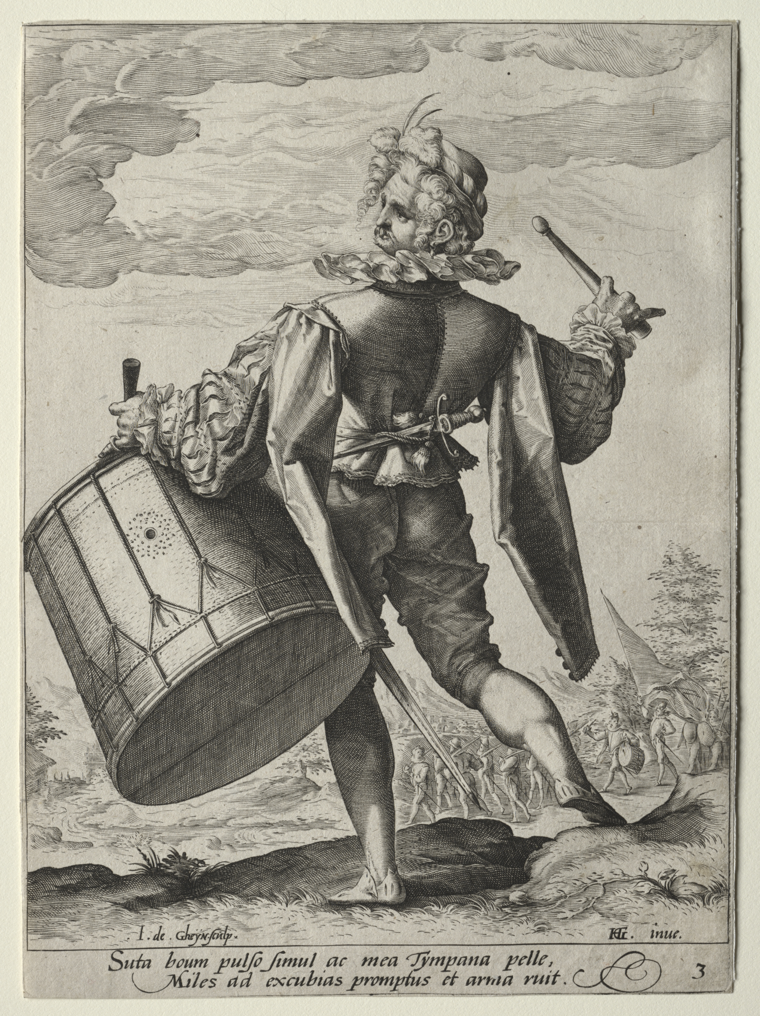 Black and white drawing of a man with back to viewer, turned slightly right. He wears a feathered hat, billowy sleeves with cuffs, puffy short sleeves, loose-fitting pants tucked into boots, and a cape. He holds a drumstick in right hand and a large drum in left. The drum has lines and circles on it. A landscape with trees and clouds in background. Text at bottom. A group of people to the right.
