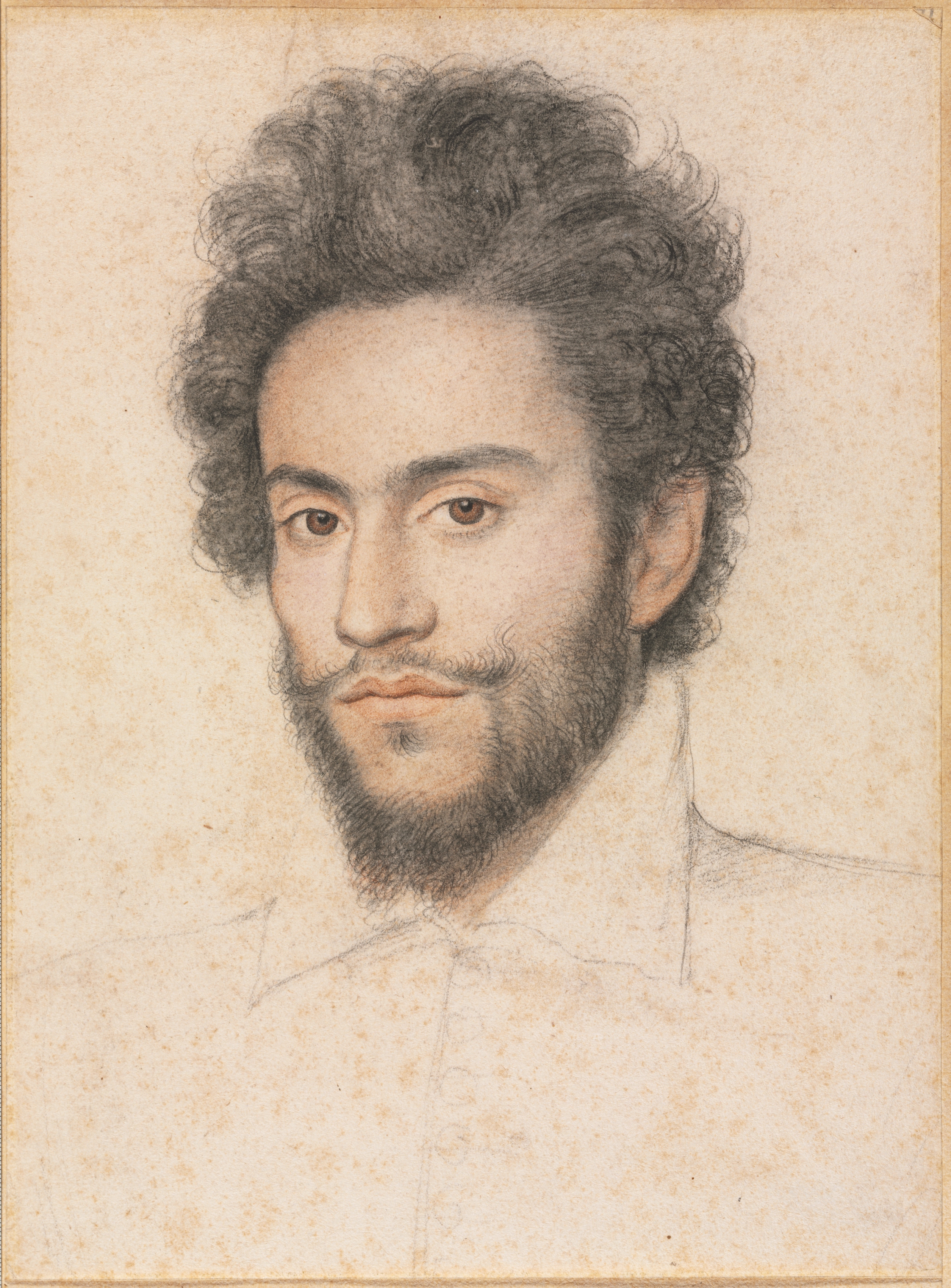 A drawing of a man with curly hair and a beard. The man has dark brown eyes, thick curly dark hair and a well-groomed beard and moustache. He wears a white collared shirt. The drawing is in a realistic style with detailed shading. The background of the drawing is a light brown color with darker brown spots and a thin brown border. The drawing is titled Young Man with a Beard by François Quesnel.