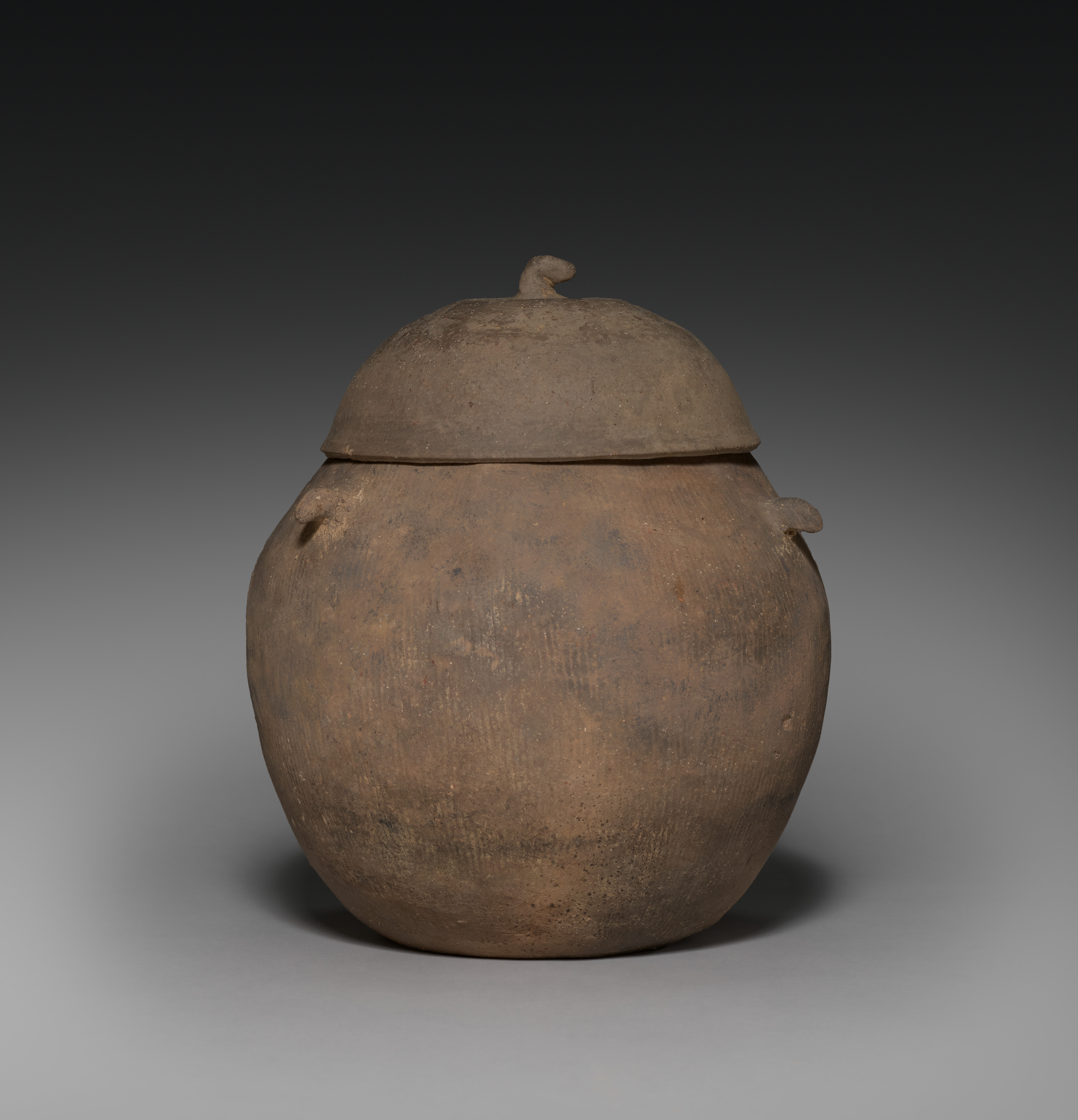 Brown clay lidded jar with four horn-like lugs, two on each side. The jar is rounded, with a domed lid that has a small knob on top. The surface is unglazed and rough. The background is a gradient from dark gray at the top to light gray at the bottom.