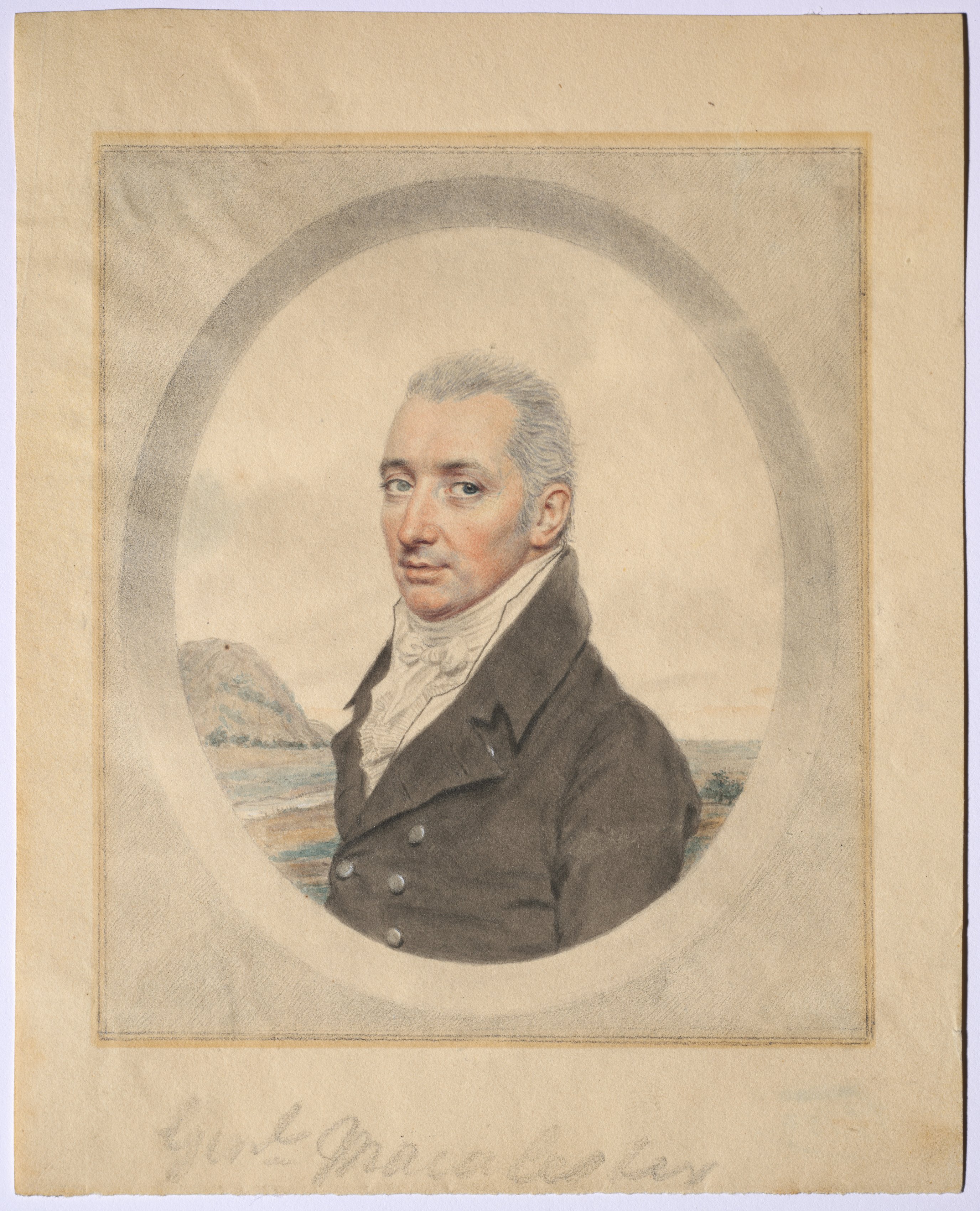 Portrait of a man with short gray hair, wearing a dark-colored jacket with six buttons down the front and a white cravat. The man is positioned within an oval frame. He is shown facing slightly to his right. His jacket has a high collar. The background behind him appears to be a landscape with a body of water and a hill or mountain on the left. The portrait is set against a beige background with a darker border around the oval frame. The artwork appears to be on aged paper.