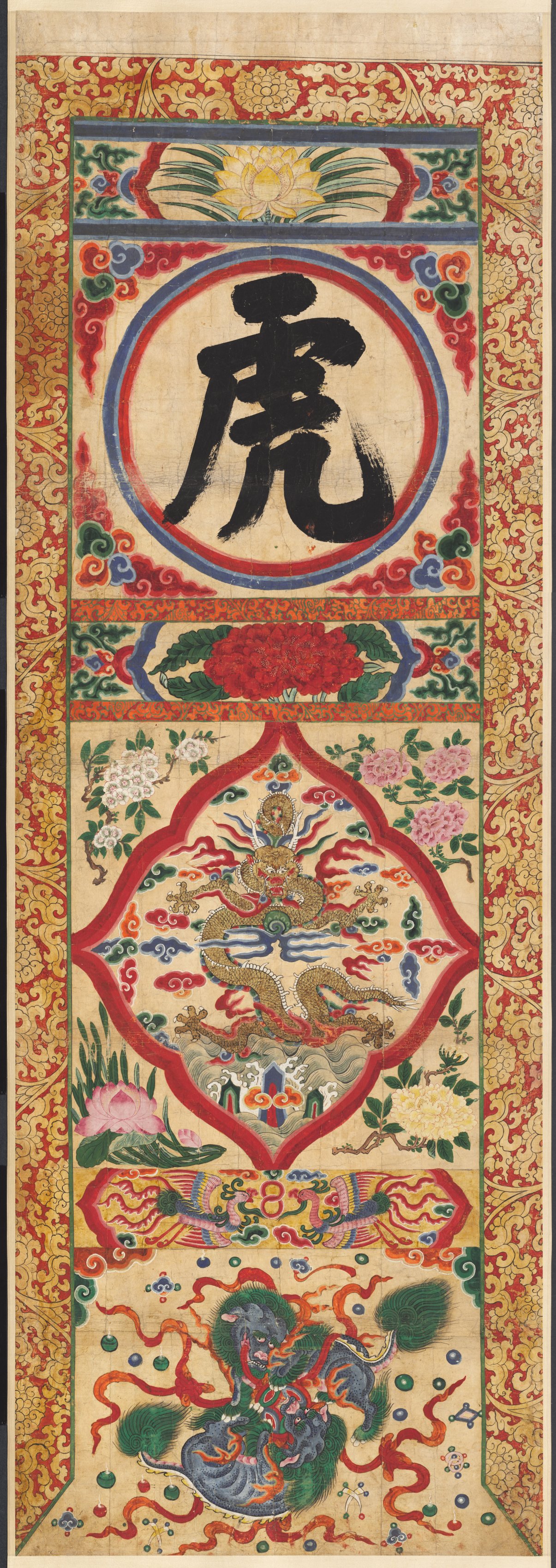 The image depicts a vertically oriented panel divided into three sections. The top section features a large black Chinese character enclosed within a red and blue circle on a beige background. The character is positioned on a red and gold patterned rectangle that spans the width of the panel. Above and below the character are horizontal rectangles with a blue and green design. The rectangle is framed by a red and gold border. The middle section showcases a red-outlined, four-leaf-clover-shaped motif featuring a gold dragon. The dragon is surrounded by pink flowers and green leaves on a beige background. The bottom section displays a blue creature with green hair and red accents amidst red swirls and green and blue dots on a beige background. The entire panel is bordered by a red and gold pattern. The artist's work, titled "Painted Panel of Character 'Tiger'", presents a vibrant and intricate design.