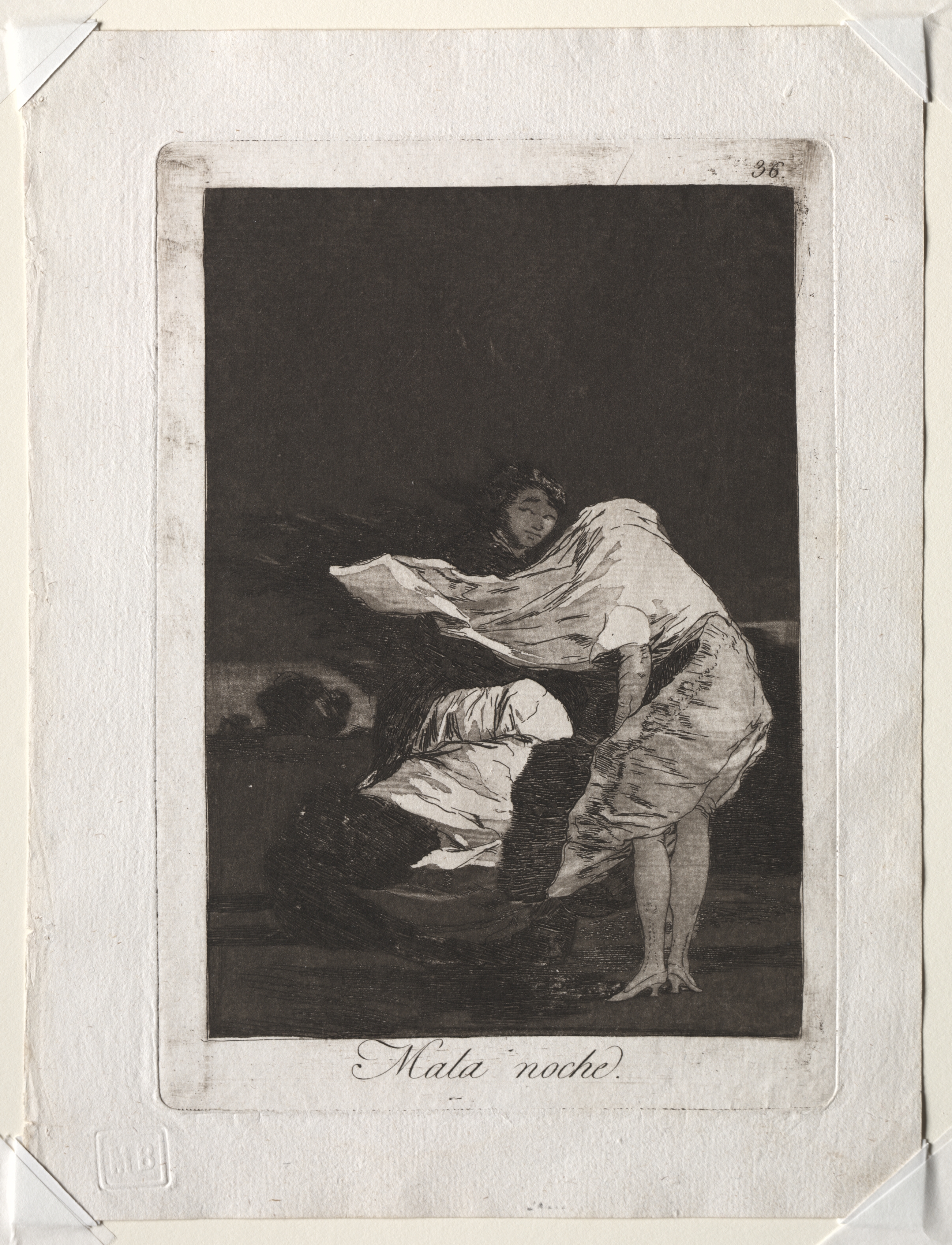 The print shows a woman in a white garment bent over another person lying on the ground. The woman's garment is draped over her head and shoulders. Her right hand holds the garment outstretched, while her left hand grips the back of the white garment of the person on the ground. The person on the ground is wearing a white garment as well. They have one leg bent at the knee and the other leg extended. A dark background surrounds them, with a lighter area behind the woman. The title "A Bad Night" or "Mala noche" is at the bottom of the print. The image is framed by a thick off-white border.