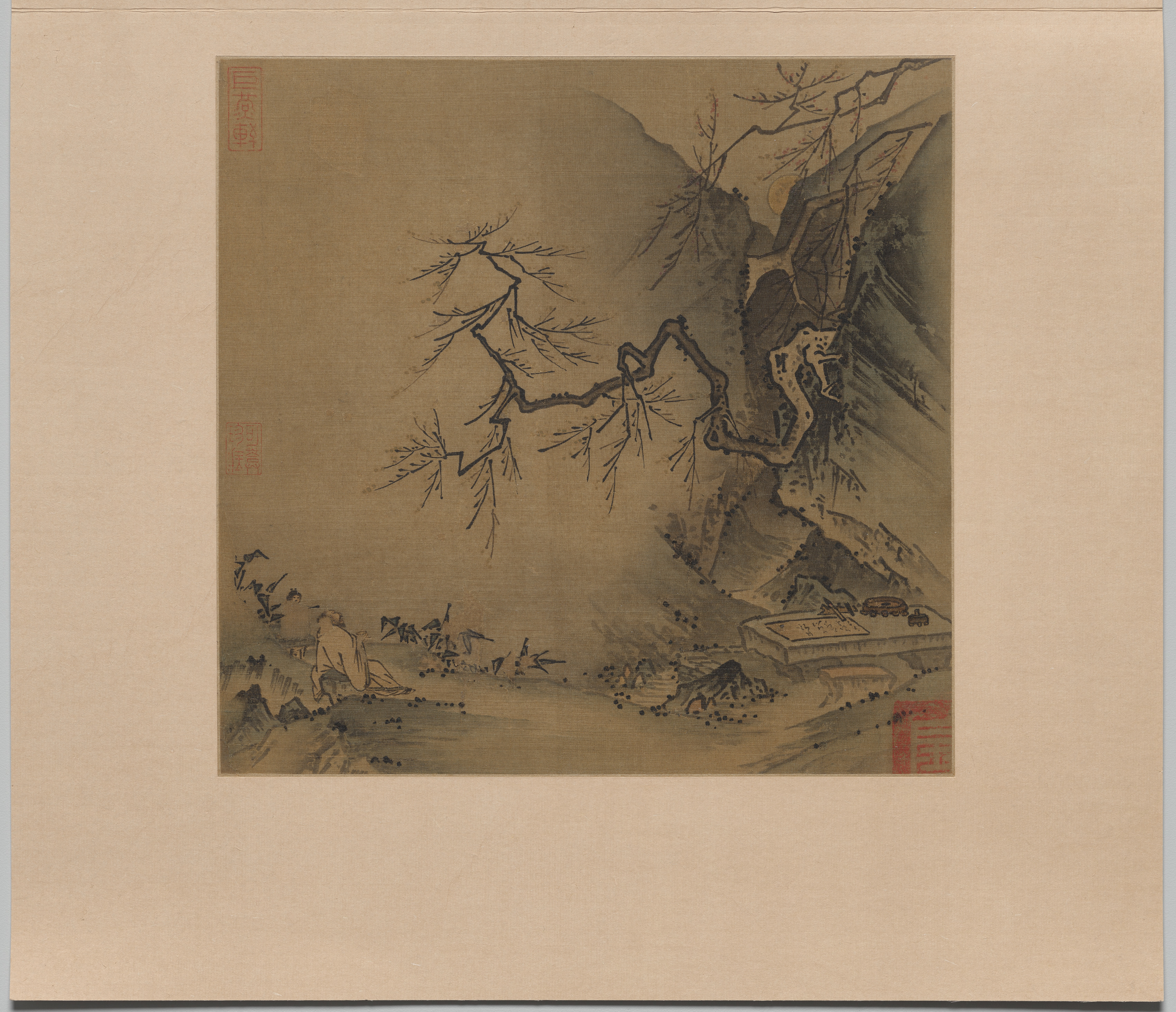 The painting "Drinking in the Moonlight" by Ma Yuan depicts a man sitting on a rocky outcropping, wearing a long white robe. He sits with his back to the viewer, looking left. His right leg is bent, and his right arm rests on his knee. A large tree with bare branches grows from a rocky slope to the right of the man. The tree's trunk is thick and gnarled, with a few branches extending outwards. A rectangular object sits at the base of the tree. The background features a mountainous landscape with additional trees and rocks. The painting is rendered in muted colors, with shades of brown, gray, and black dominating the scene. Two red seals are visible in the top-left and bottom-right corners of the painting. The artwork is set against a beige background.