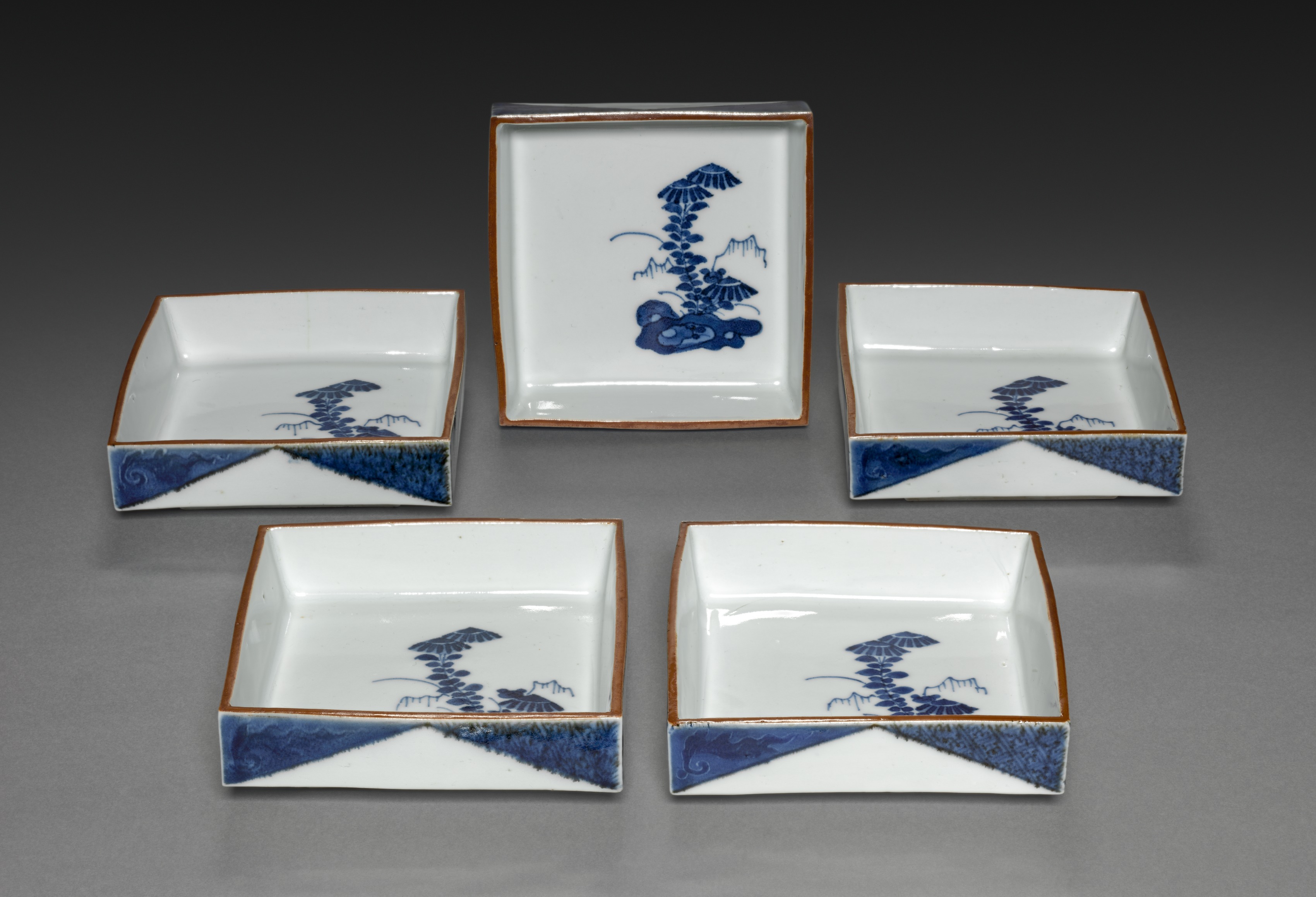 Five white square and rectangular plates with blue and brown designs. The four plates in the corners and bottom have a brown border, a blue design on the inside, and blue accents on the bottom. The plate in the center is rectangular and larger than the others. The blue designs on all plates feature a tree-like figure. The background is gray and darkens towards the top. The title of the image is "Side-Dishes with Dandelion in Rocks" by an unknown artist.