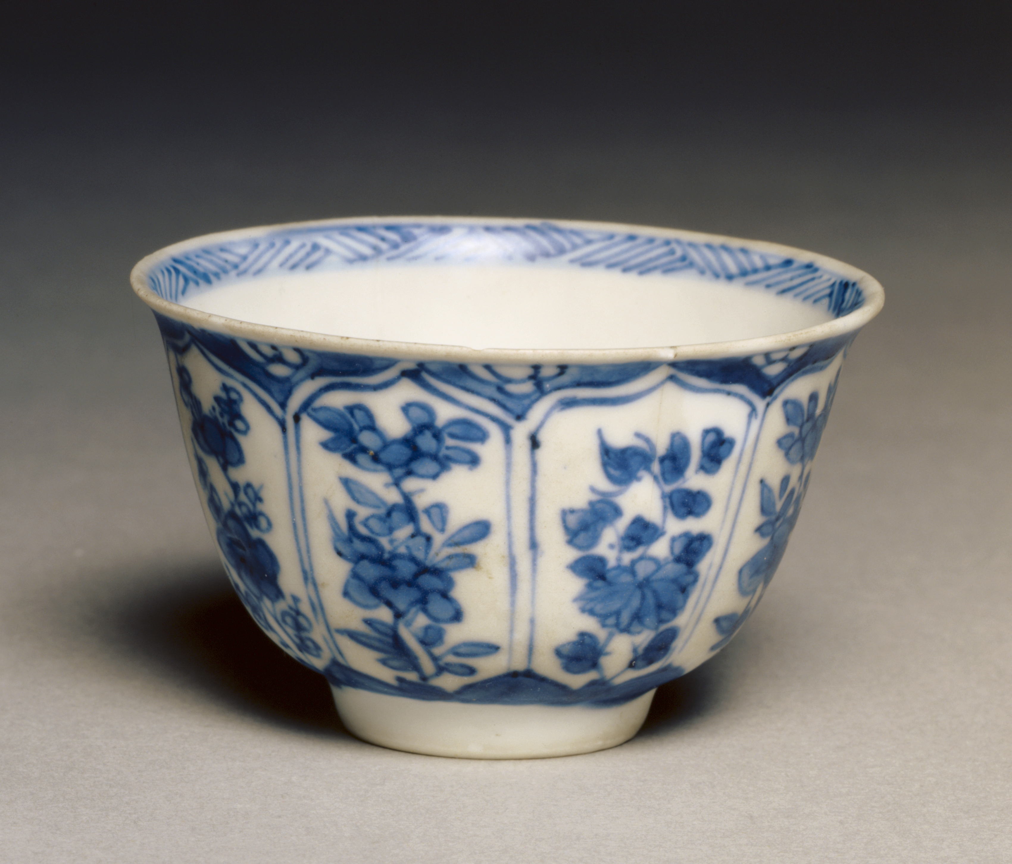 The image shows 'Tea Cup' by an unknown artist. The object is a small, white porcelain cup with blue floral designs on the outside and a patterned rim on the inside. The cup has a wide mouth and a narrow base. The exterior features a repeating pattern of blue flowers and leaves on a white background, divided into sections by blue lines. The rim of the cup has a blue and white geometric pattern. The cup is sitting on a flat surface with a shadow cast to the left. The background is a gradient from dark gray at the top to light gray at the bottom.