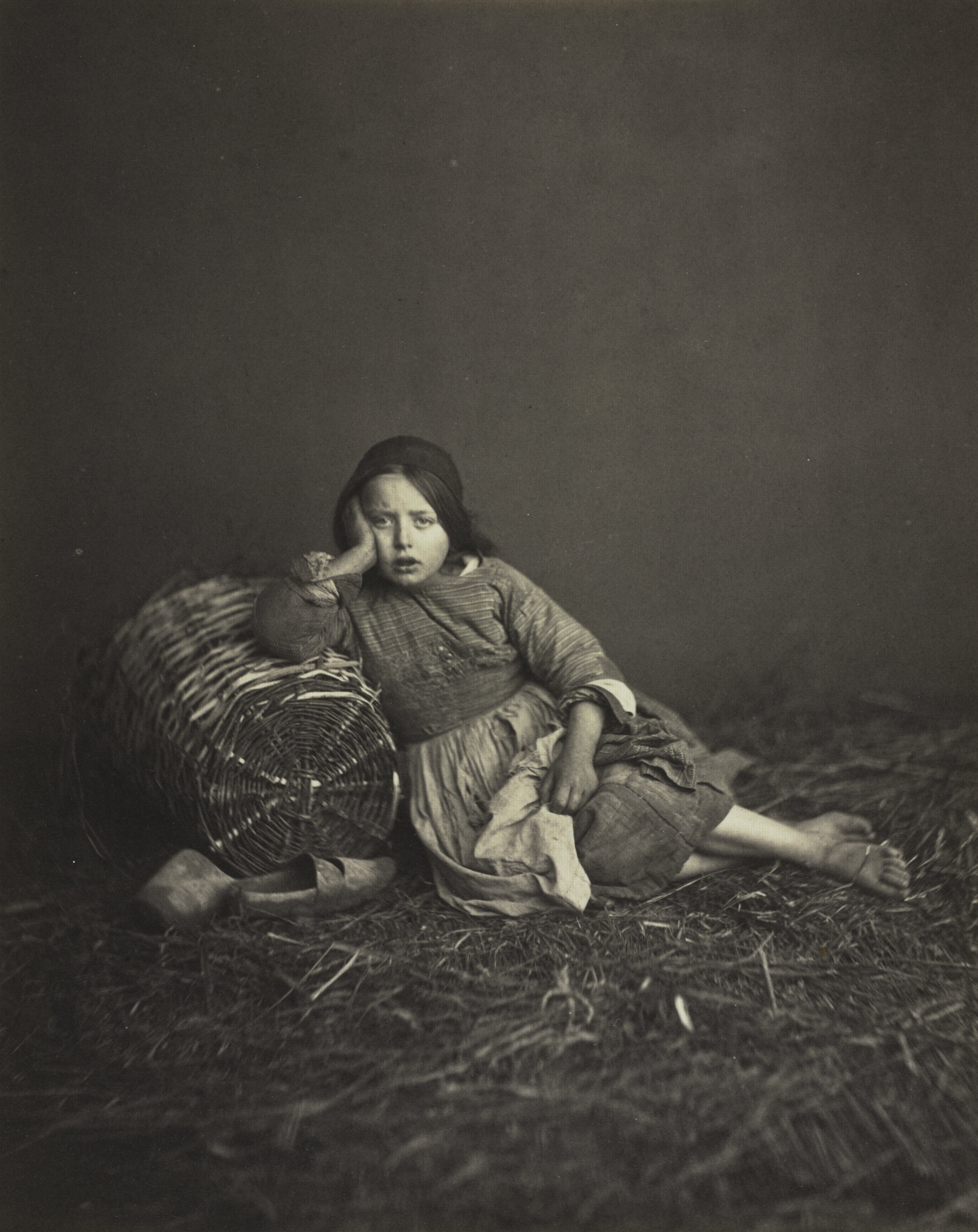 Black and white image of a girl sitting on straw. The girl is wearing a dress and a head covering. She has her right elbow on a large basket and her head resting on her right hand. Her left hand is on her lap holding a cloth. The girl is barefoot. She is sitting on straw with more straw in the background. The background is a dark wall. The girl is looking at the camera with a serious expression.