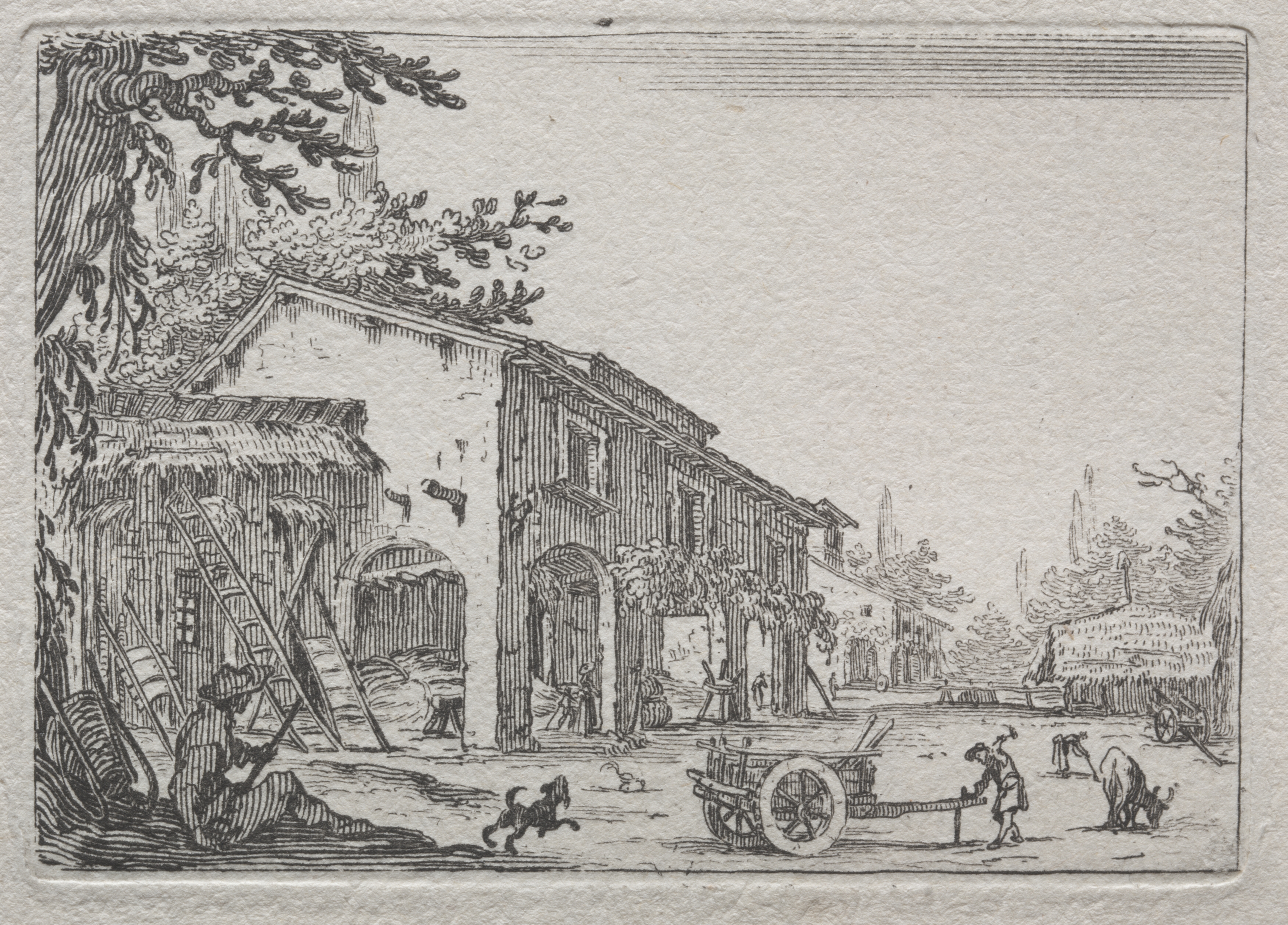 The image depicts a black and white etching of a rural Italian scene. A large tree trunk is on the left side. A dirt road runs along the left side of the image, lined with buildings that have tiled roofs and archways. There are people and animals on the road, including a man pushing a cart with one wheel and a dog. There are more buildings, trees, and a tent-like structure in the background. The sky above is blank. The image is bordered by a thin line and has a textured appearance. The scene represents "The Italian Farm" by Jacques Callot.