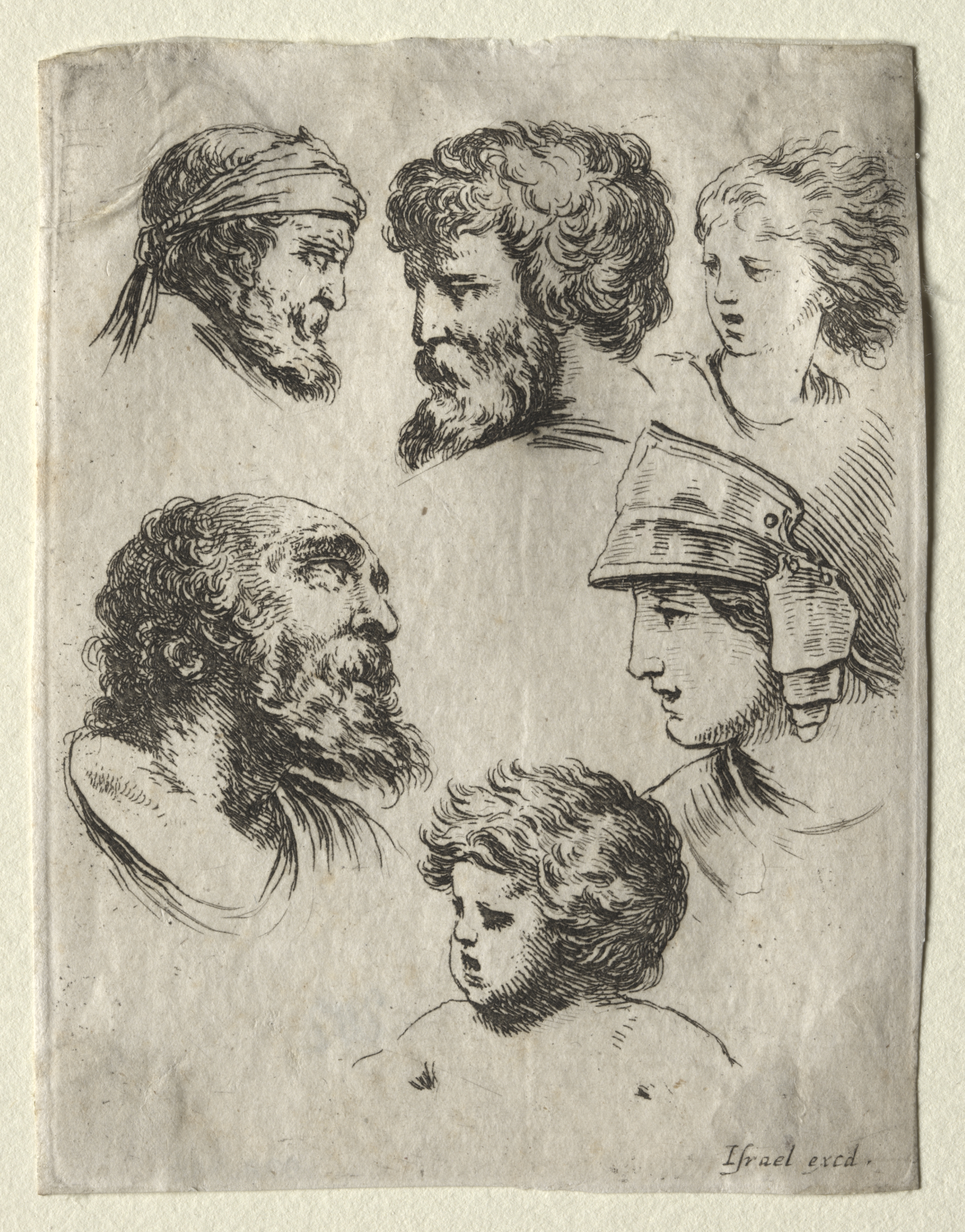 Black and white drawing on aged paper. Six human heads drawn, three on top and three on bottom. Top row: - A man with a headscarf and beard looking right. - A man with curly hair and beard looking right. - A woman with wavy shoulder-length hair looking down and right. Bottom row: - A man with curly hair and beard looking right. - A man with short curly hair looking up and right. - A man in a military-style hat with short hair looking left. The artist's signature appears in the bottom right corner.