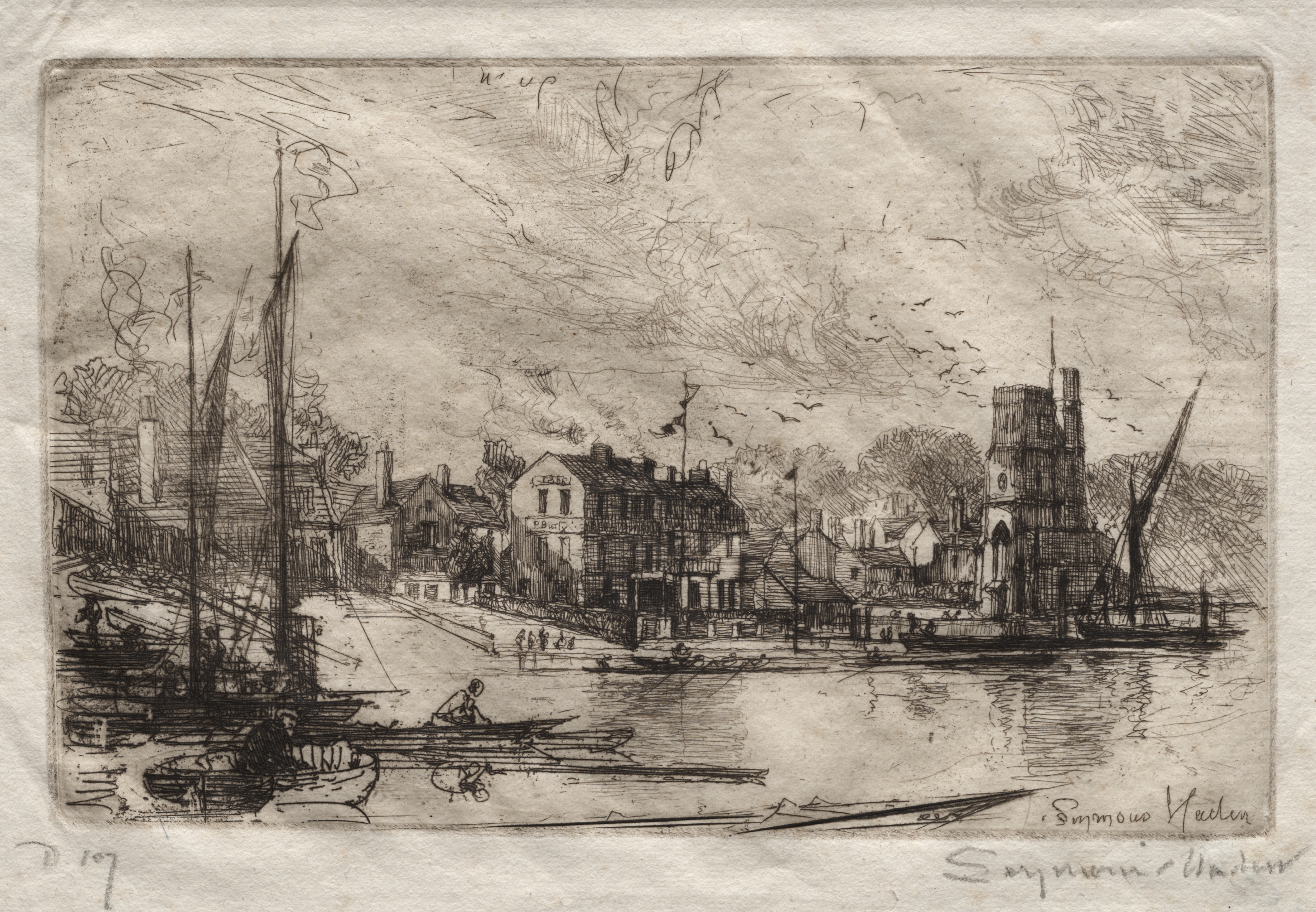 The etching depicts a waterfront scene. A body of water is in the foreground. A boat with a pointed bow is on the right. A row of buildings lines the waterfront on the left. People are on a dock. A church with a tall tower is on the right side. Boats are on the left. The sky is cloudy with flying birds. The artist's signature is in the bottom-right corner. "Harry Kelly's, Putney" is written at the top.