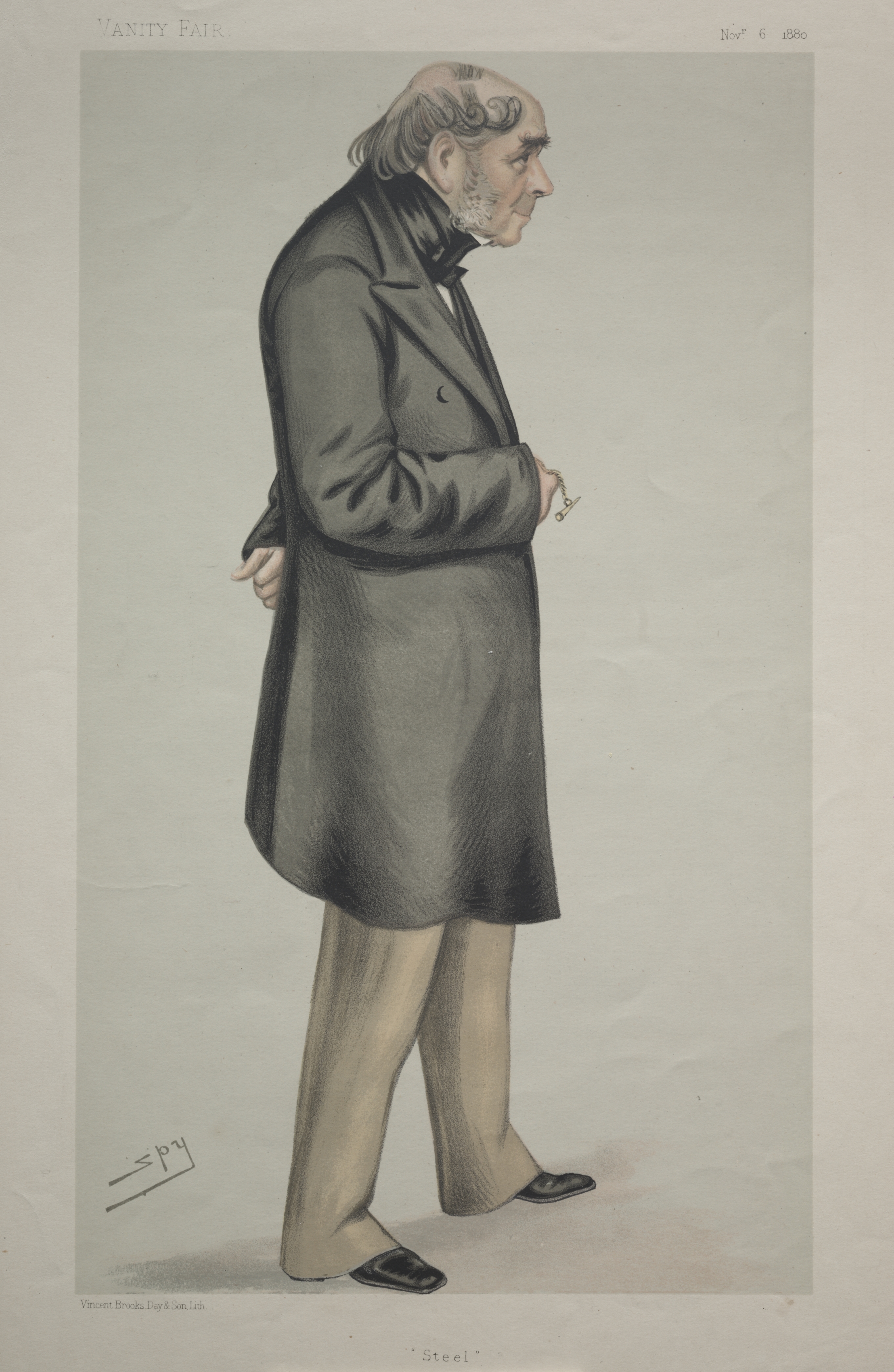 The image depicts a man in profile facing right. He has a receding hairline with gray hair combed back, and a short gray beard and mustache. He wears a long dark coat with a high collar, a white shirt with a black bow tie, light-colored pants, and black shoes. His hands are clasped in front of him. The background is light grey with the words 'Vanity Fair' in the upper left corner and 'Nov 6 1880' in the upper right corner. The image is titled 'Steel' and signed 'Spy'.
