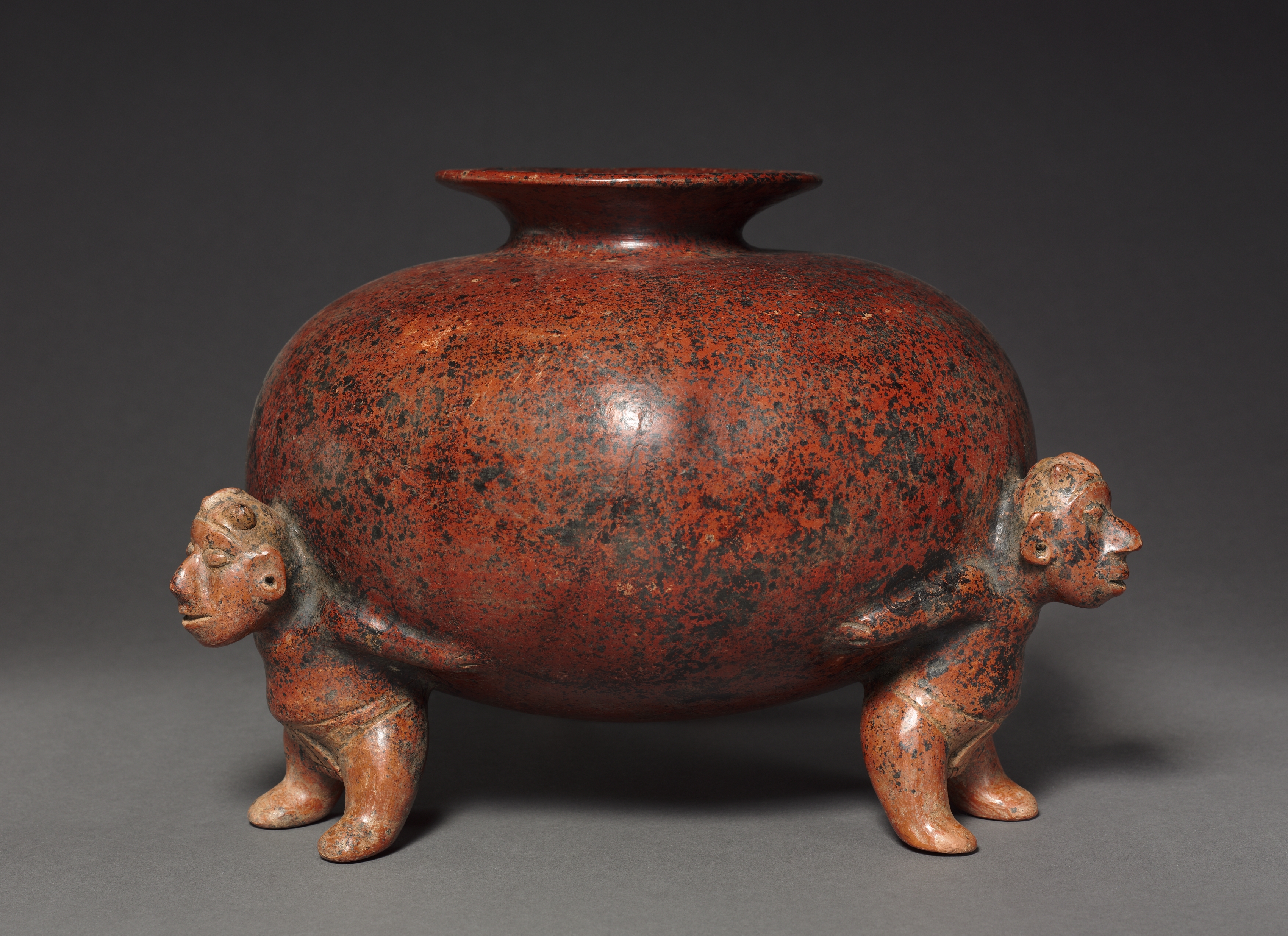 Red-brown speckled vessel with black spots; rounded body; short neck; wide mouth; two Atlantean figures on either side supporting vessel. The figures have their arms bent at elbows. They are depicted from mid-thigh up. Each figure has a crest on their head. The background is gray.