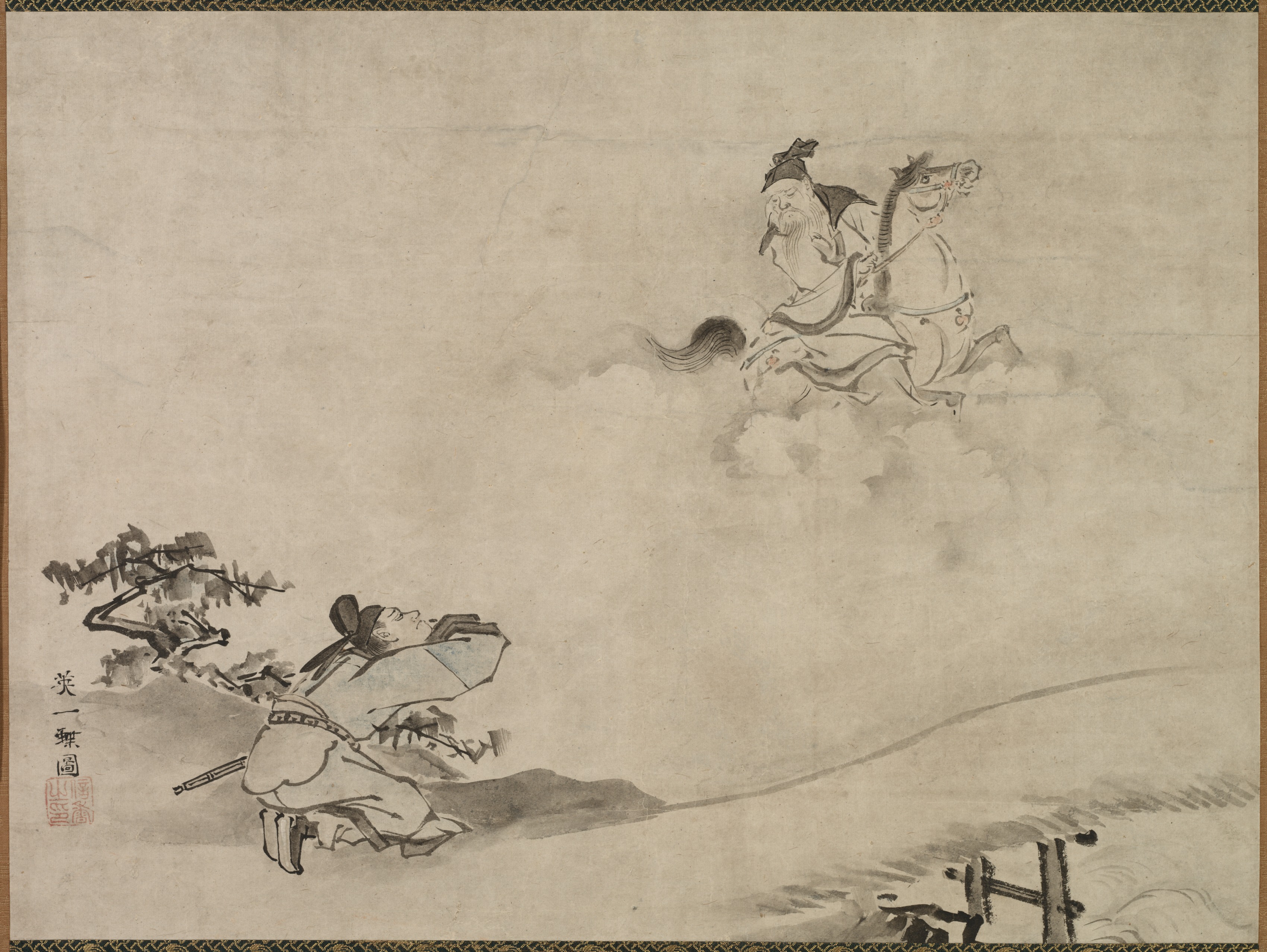 The artwork depicts a man on horseback and another man on the ground. The man on horseback is wearing a long robe and a hat, sitting on a horse that appears to be surrounded by clouds. The horse faces left, with its head turned to the right; its tail streams behind it. The man on the ground is wearing a robe and a headband; he holds a long staff in his right hand. He appears to be crouching or falling to the ground, looking up towards the man on horseback. There are trees to the left and hills in the background. The artwork is rendered in black and white with some red stamps. The background is a light brown color. The artwork appears to have a decorative border around the edges. The image depicts a scene from a traditional Asian narrative. The artwork is titled "Daoist Immortal" and was created by Hanabusa Itchō.