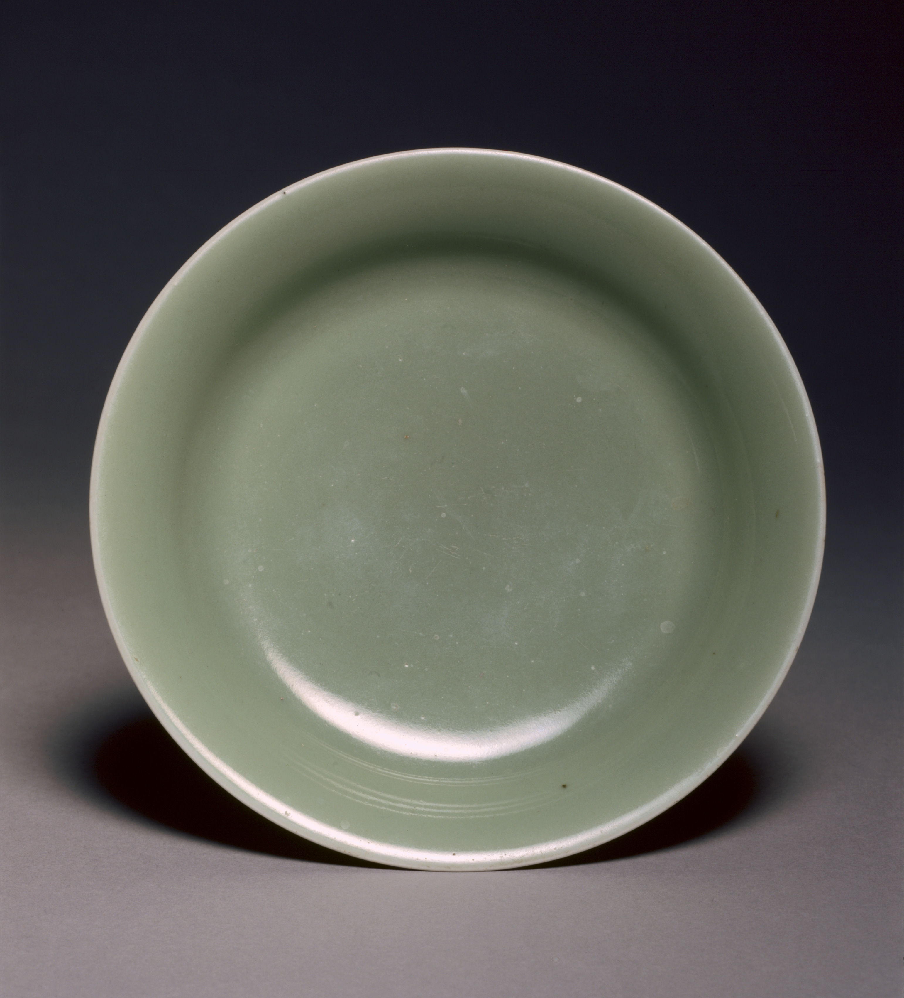 Pale green plate with a wide, shallow bowl and a narrow rim, viewed from the front at an angle. The plate has a glossy glaze. The background is dark gray with a lighter gray surface that the plate sits on. A shadow is cast to the left. The plate is titled "Plate".