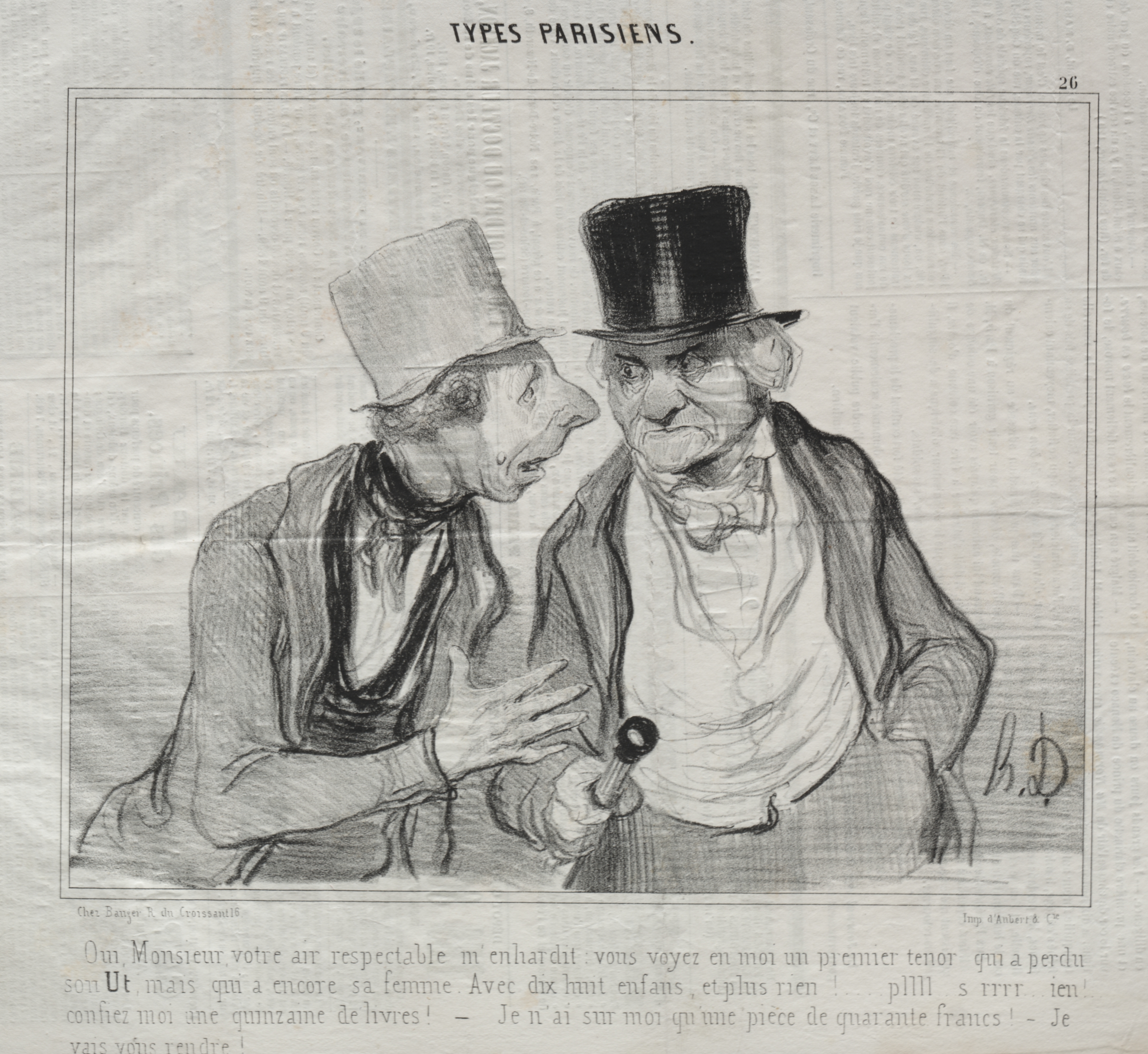 Black and white drawing of two men in top hats. The man on the left has a tall cylindrical hat, a large nose, and a crumpled scarf around his neck. He wears a jacket with a vest underneath. His left hand is raised near the other man's chest. The man on the right has a shorter, wider top hat, a white shirt with a bowtie, and a jacket draped over his shoulders. He holds a cane in his right hand. Both men appear to be older, with facial features emphasizing their noses and expressions. They are surrounded by a thin-lined square with "TYPES PARISIENS" written above. There is small illegible text below the drawing. The background resembles aged paper.