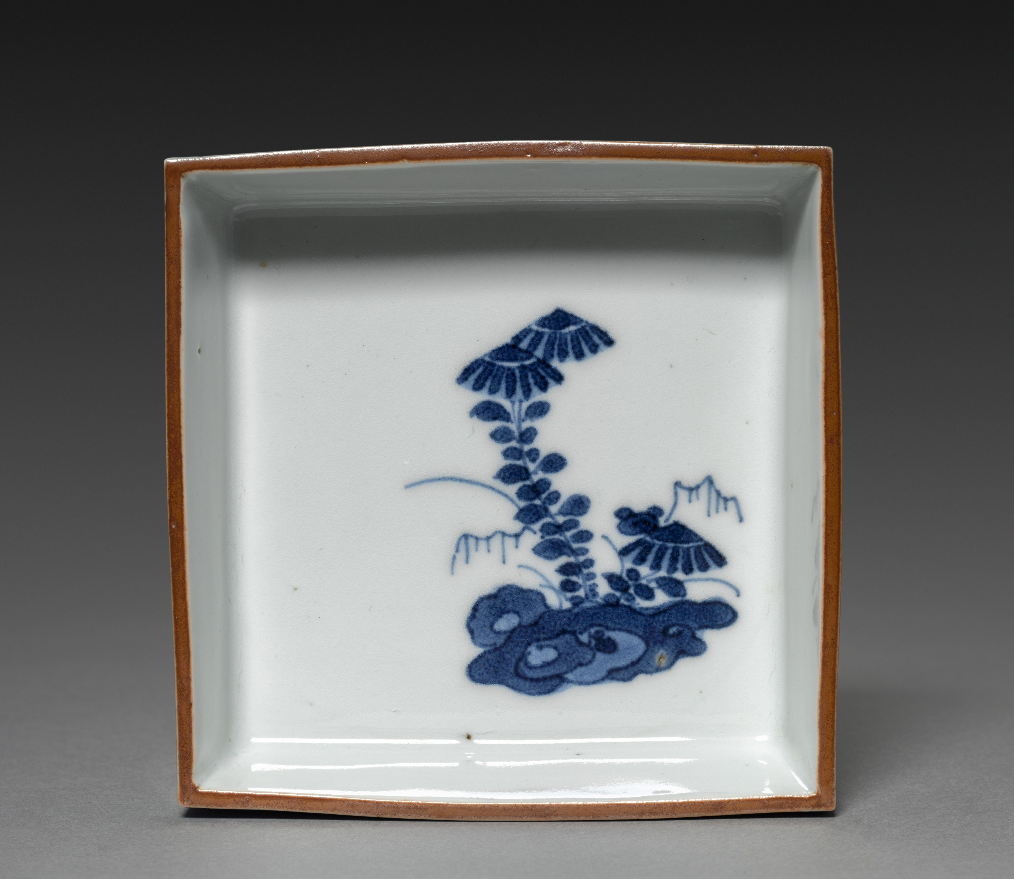 The image shows a square plate titled "Side-Dish with Dandelion in Rocks" by an unknown artist. The plate has a white interior with a brown rim and a blue design. The design features a plant with a long stem and leaves, resembling a dandelion, growing out of a cluster of rocks. The plant has two flower heads with many thin petals. The plate sits on a gray surface against a dark background. The plate's edges are slightly raised. The plate appears to be made of ceramic or porcelain. The image is well-lit, with a light source coming from the front. The overall appearance of the plate suggests it is an antique or vintage item.