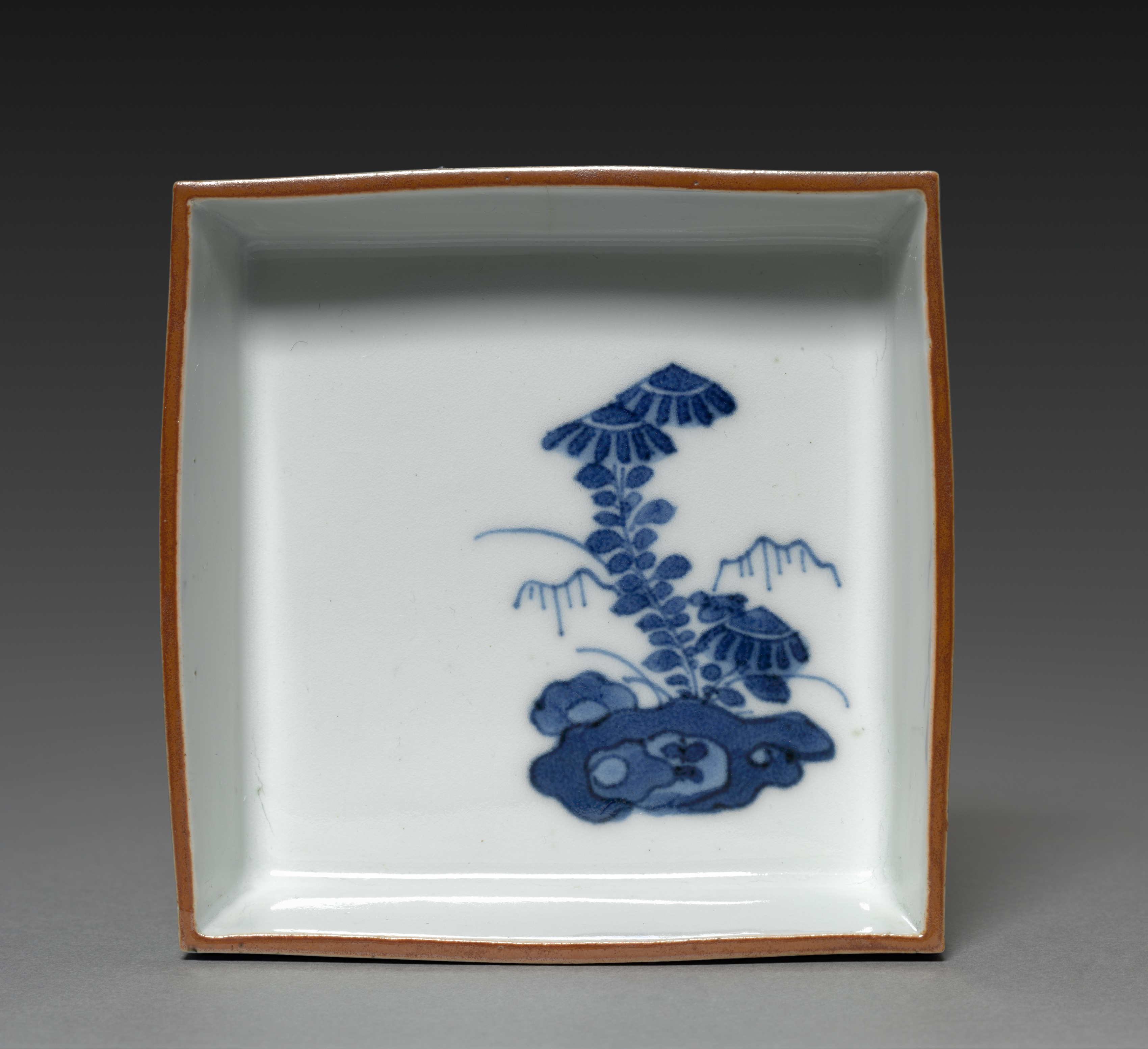 The image shows a square dish with a white interior and a brown rim. The dish has a blue design on the inside, featuring a plant with a large flower or leaf at the top and smaller ones below it, emerging from a blue rock or soil at the bottom. The plant has a long stem with several leaves and flowers. The background of the image is dark gray, with a lighter gray surface that the dish is sitting on. The overall style of the dish and its design suggests it may be an example of Asian ceramics, and the title "Side-Dish with Dandelion in Rocks" by an unidentified artist.