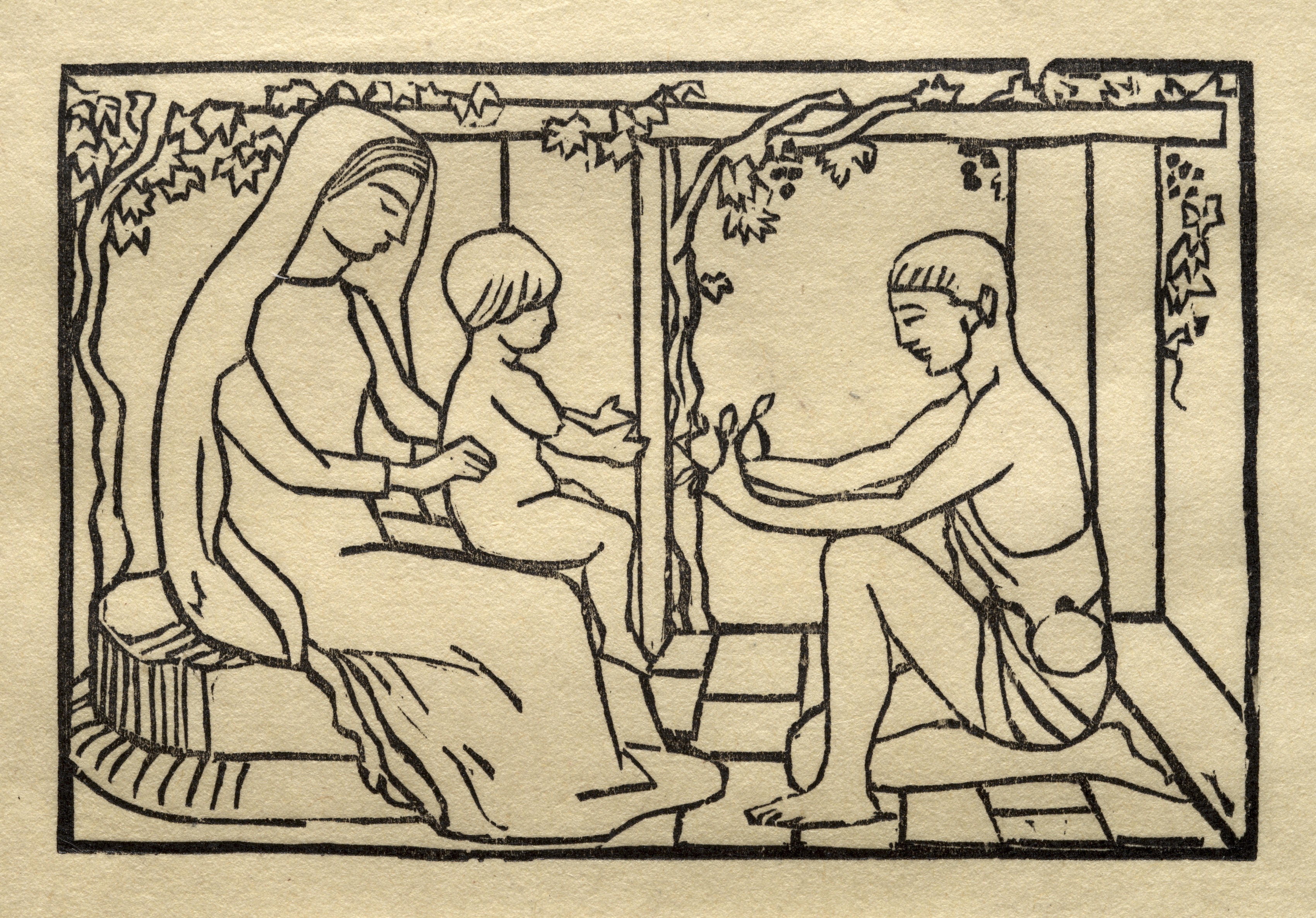 The image depicts a black line drawing on a beige background. A woman and a man are shown with a small child between them. The woman sits on the left, wearing a long dress and a head covering. Her body faces right, her head is tilted down, and her hands are positioned in her lap. The child stands between the pair, wearing only a diaper, and faces the man on the right. The man sits on the right, wearing a cloth wrapped around his waist, with his body facing left and his head slightly tilted down. His hands are outstretched toward the child. A tree trunk is behind the woman and another behind the man. There are leaves on the top border and on the tree branches. The scene is framed by a black line.