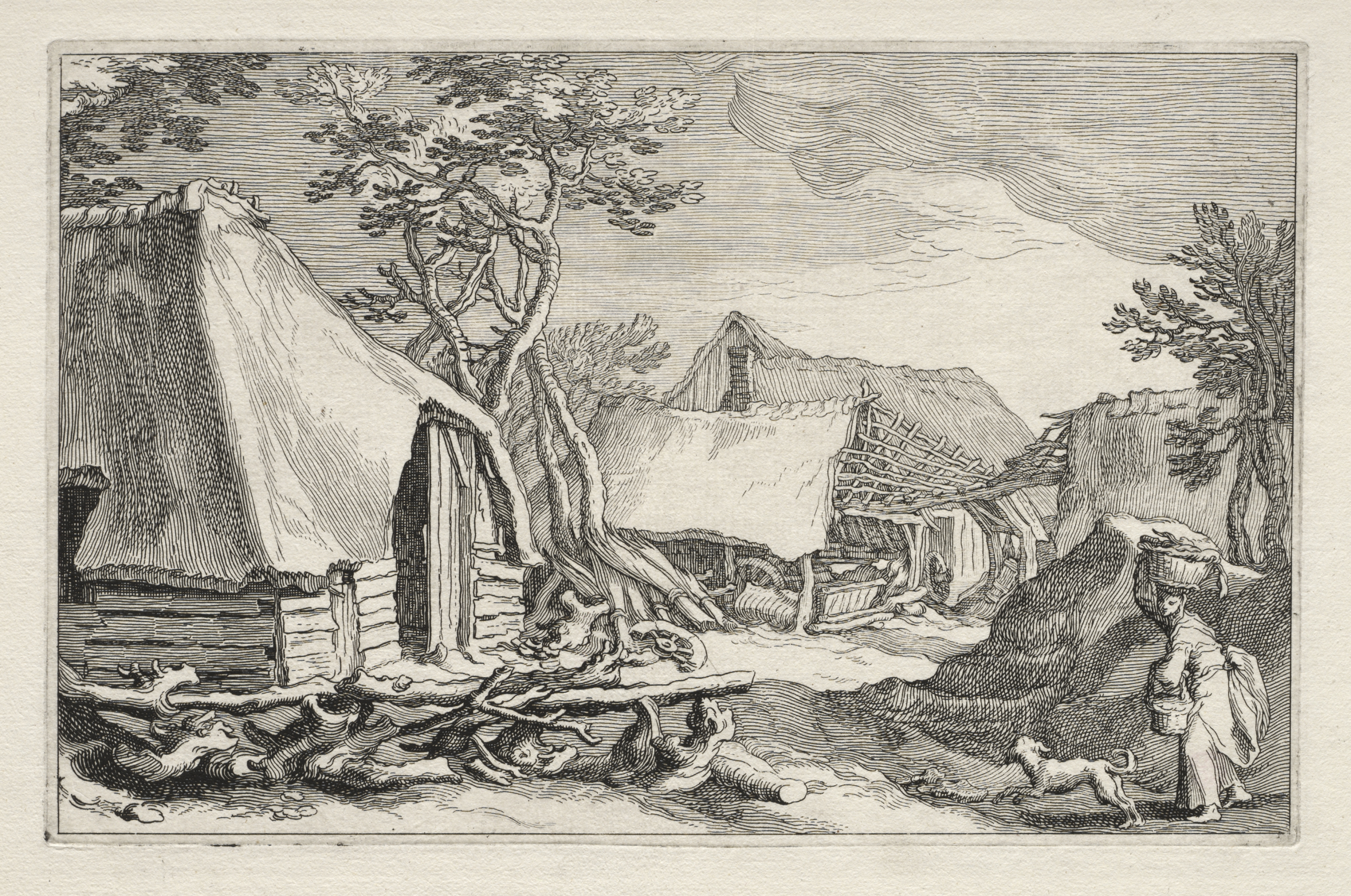 Landscape with several buildings and a woman and a dog. The image is drawn in black and white. A large tree with exposed roots is on the left. A woman wearing a headscarf and long clothes walks on the right. A dog follows behind her. There are several buildings in the background, including one with a steep roof and another with a thatched roof. A wood and plank fence is on the left. The sky is cloudy. The style is detailed and realistic. The image is by Boetius Adams Bolswert and titled Landscape with Farmhouses.