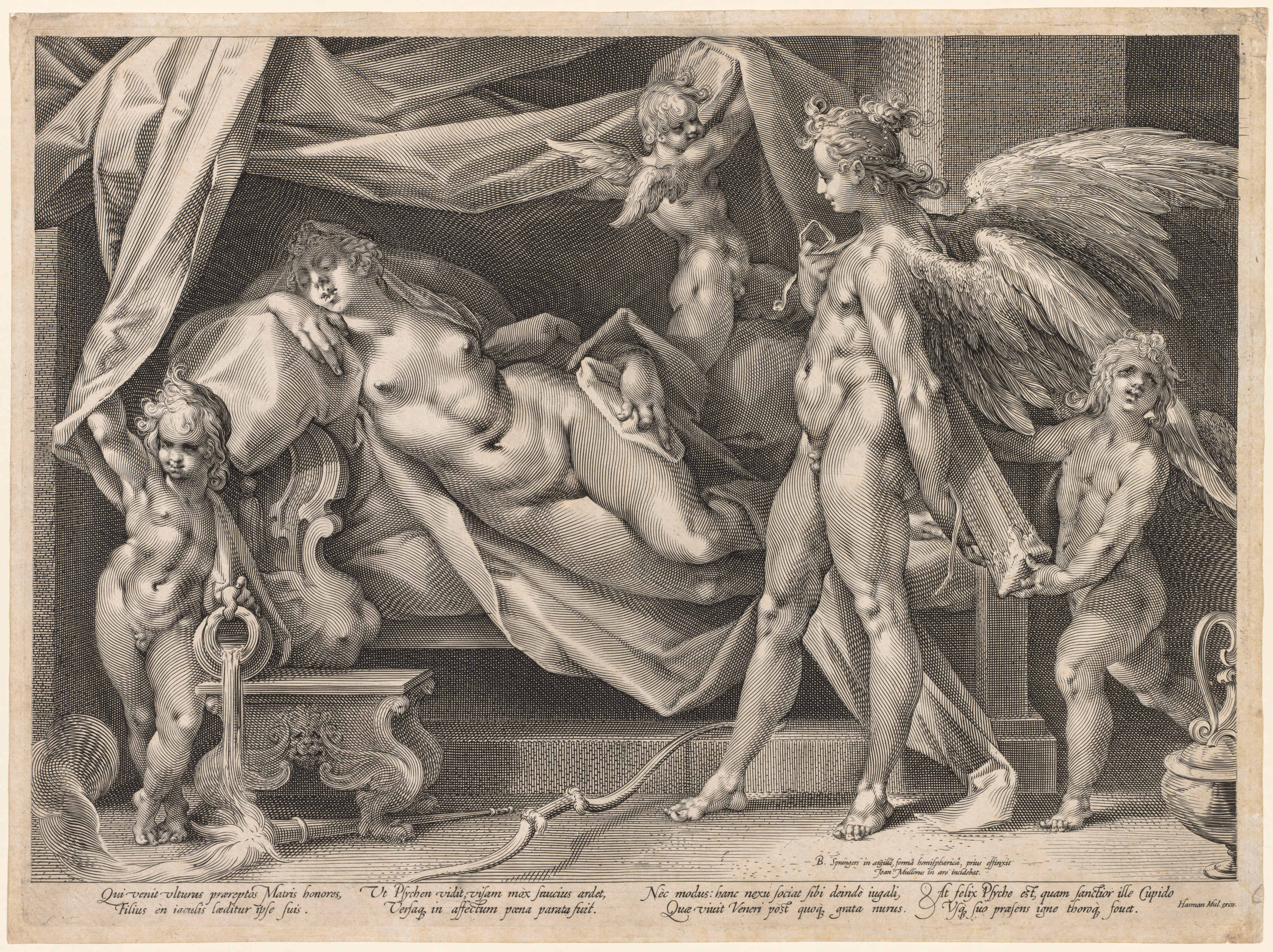 Black and white engraving of a nude man and four nude winged figures. The central figure lies on a pillow on a table covered by a cloth. The figure on the right stands and faces left. Three figures stand on either side of the central figure. The figure on the far right holds a bow. The standing figure on the left holds a ring on a chain. The figure on the far left stands with one leg on the table. The figure above is flying with wings raised. All figures have curly hair. The scene is indoors with a curtain on the left. The image has a caption in a foreign language along the bottom. The image depicts Cupid and Psyche by Jan Muller.
