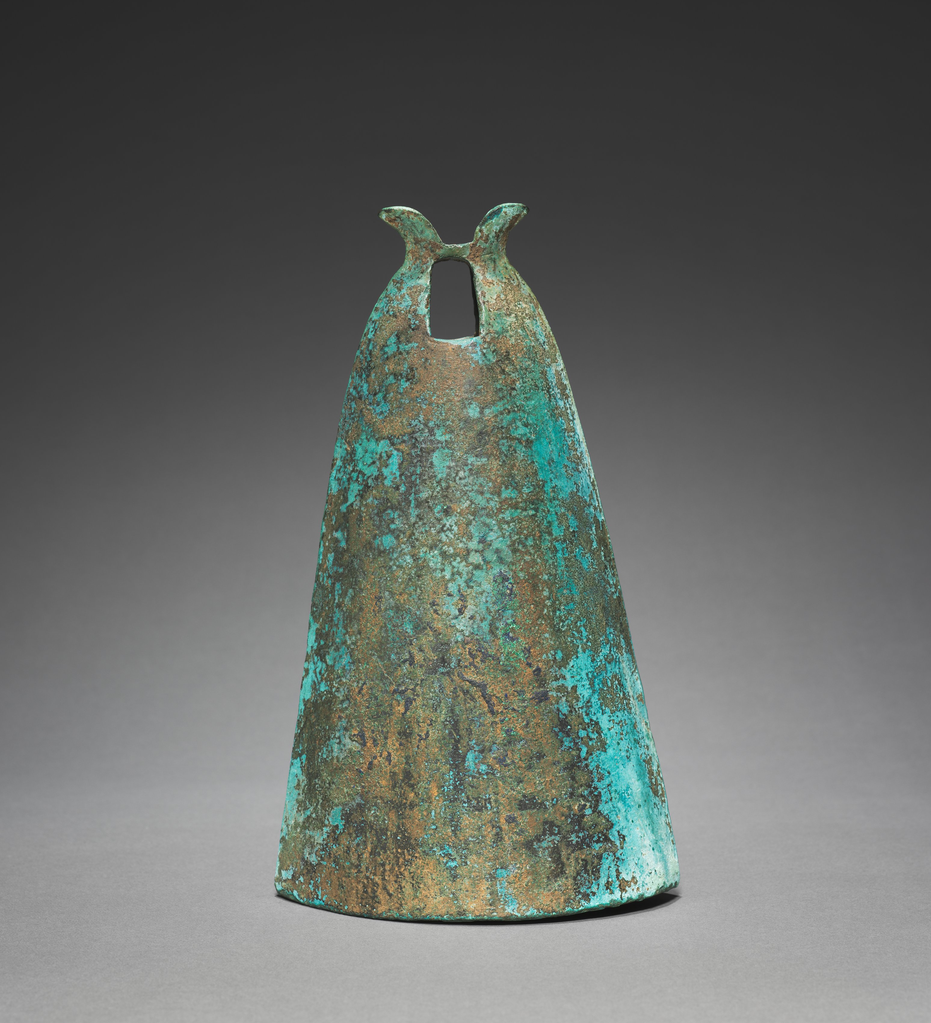 The Bell with Diamond-Shaped Insignia by Unknown Artist shows a bronze bell with a green patina. The bell is shaped like a cone with a wide base that tapers to a narrow top. Two small curved handles protrude from the top on either side of a rectangular hole. The surface of the bell has patches of green and brown. The background is dark gray and gets lighter toward the bottom.