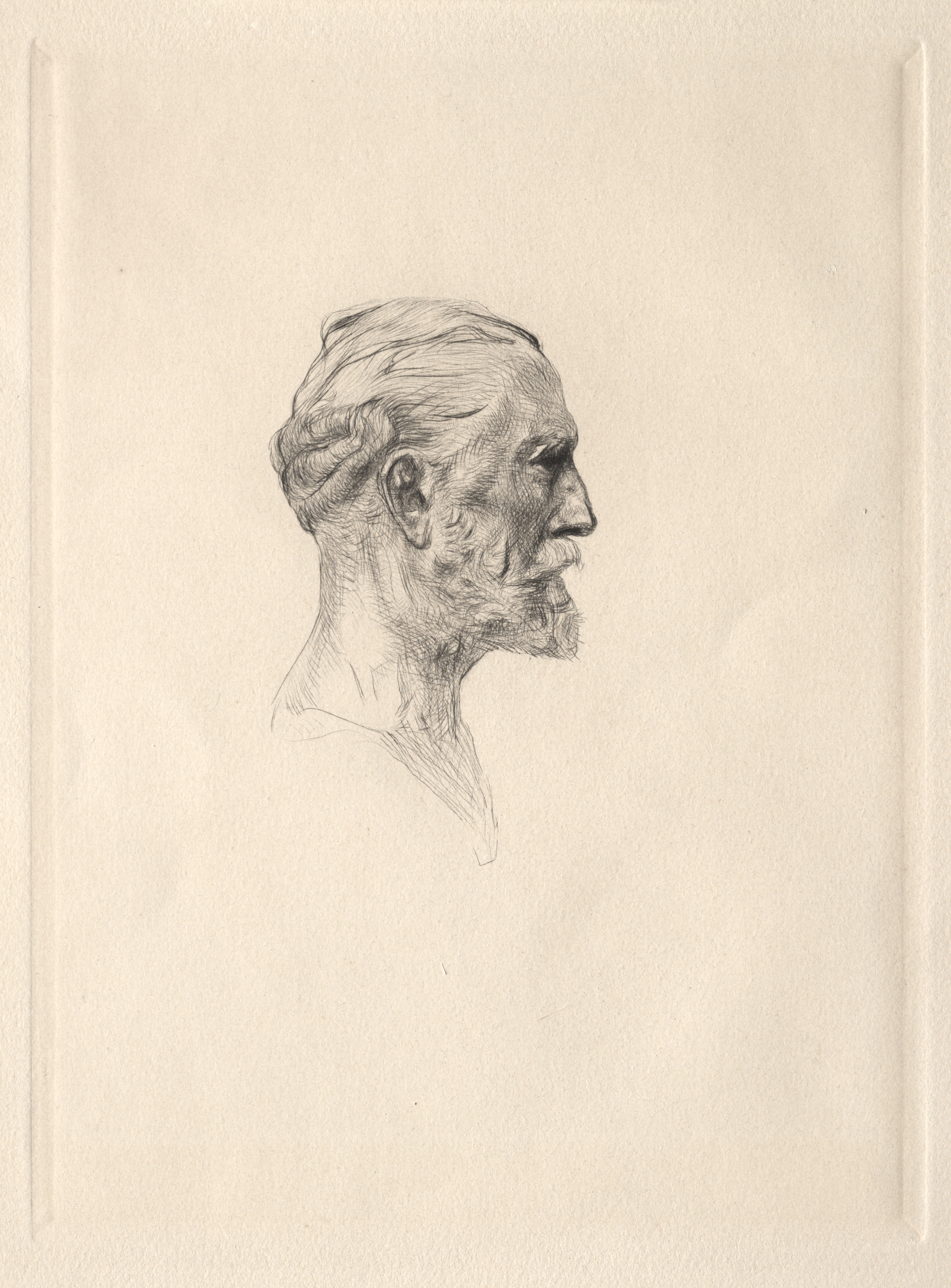 A black and white sketch of a man's head in profile, viewed to the right. The man has thinning hair combed back and a short beard and mustache. His facial features are defined with prominent cheekbones, nose, and jawline. The sketch is drawn on a beige background with a raised border. The style of the sketch is realistic with detailed shading.