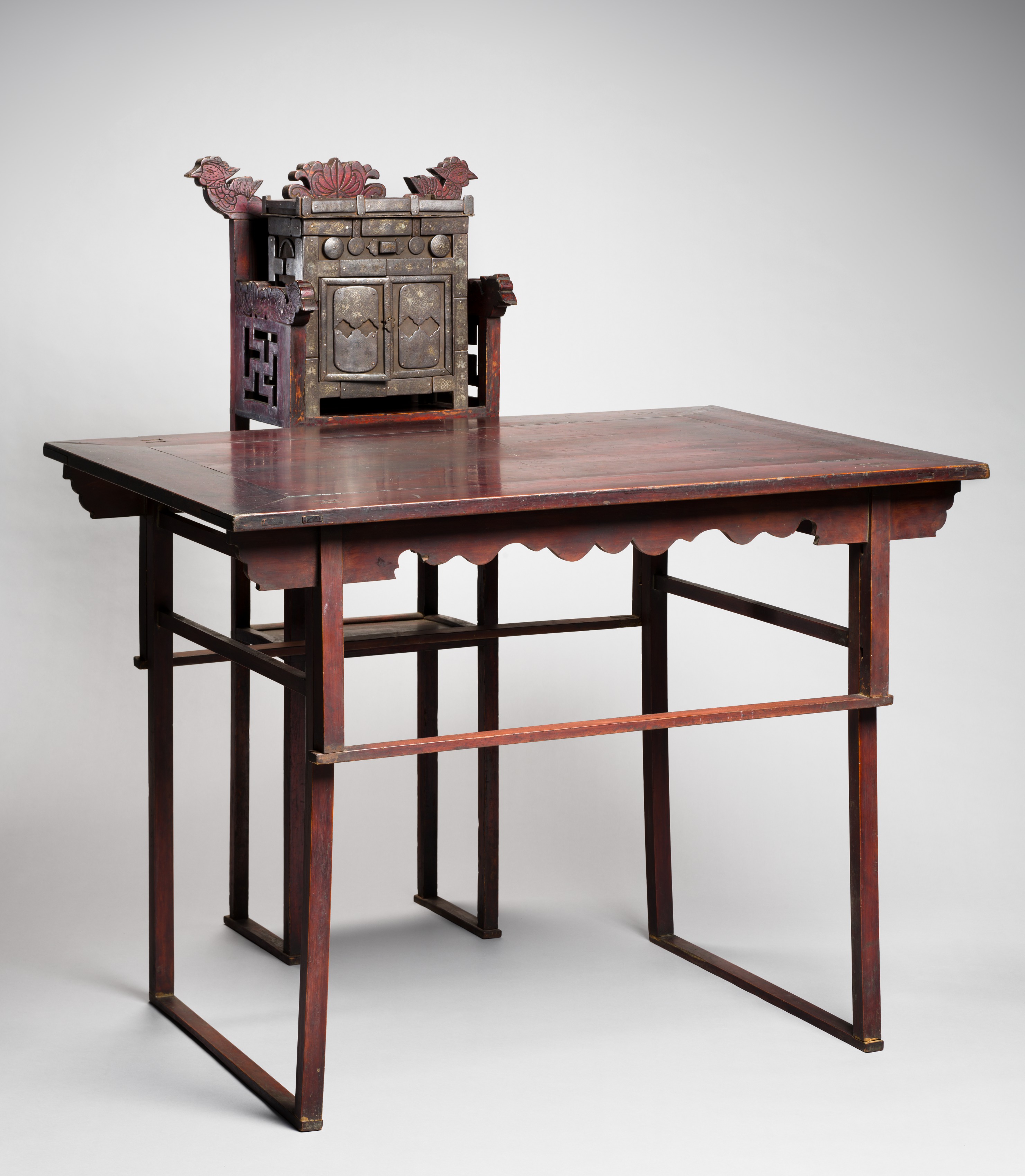 Dark wooden table with rectangular top and scalloped edges. Four legs connected by two horizontal bars. Small, ornate wooden structure on top with intricate carvings. Three carved red and gray decorative pieces on top. Two doors with carved patterns. Visible wear and discoloration on surface. Light grey background. Title: Spirit House. Artist: unknown.