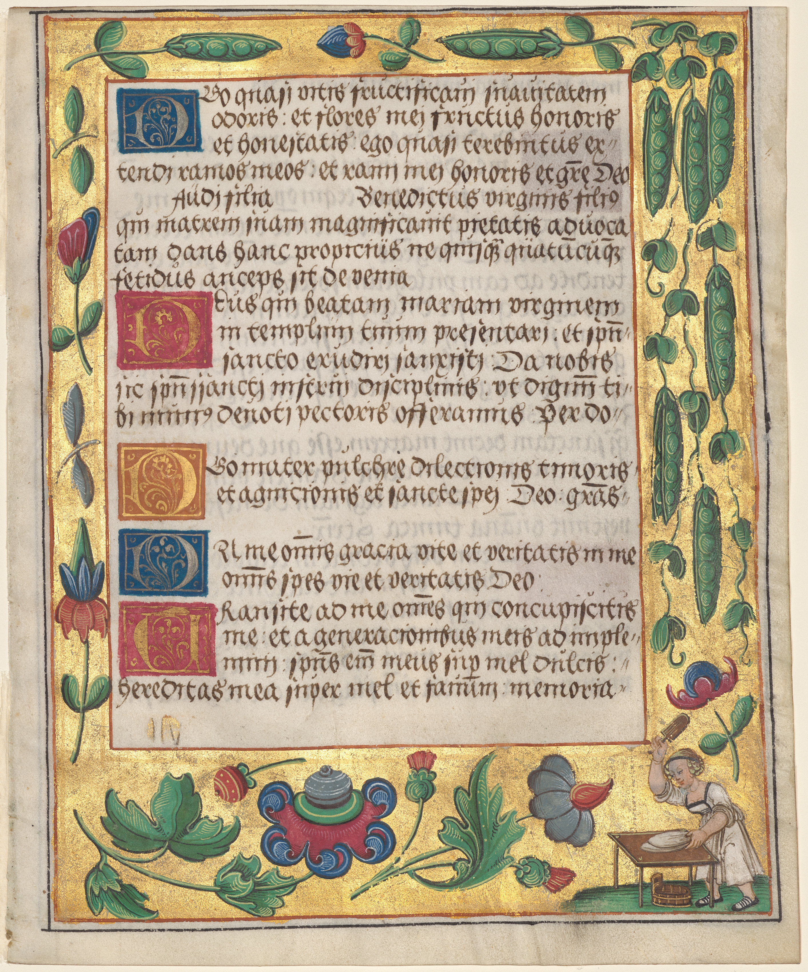 Leaf from a Psalter and Prayerbook: Ornamental Border with Pea Vines and a Girl Kneading Bread (recto)