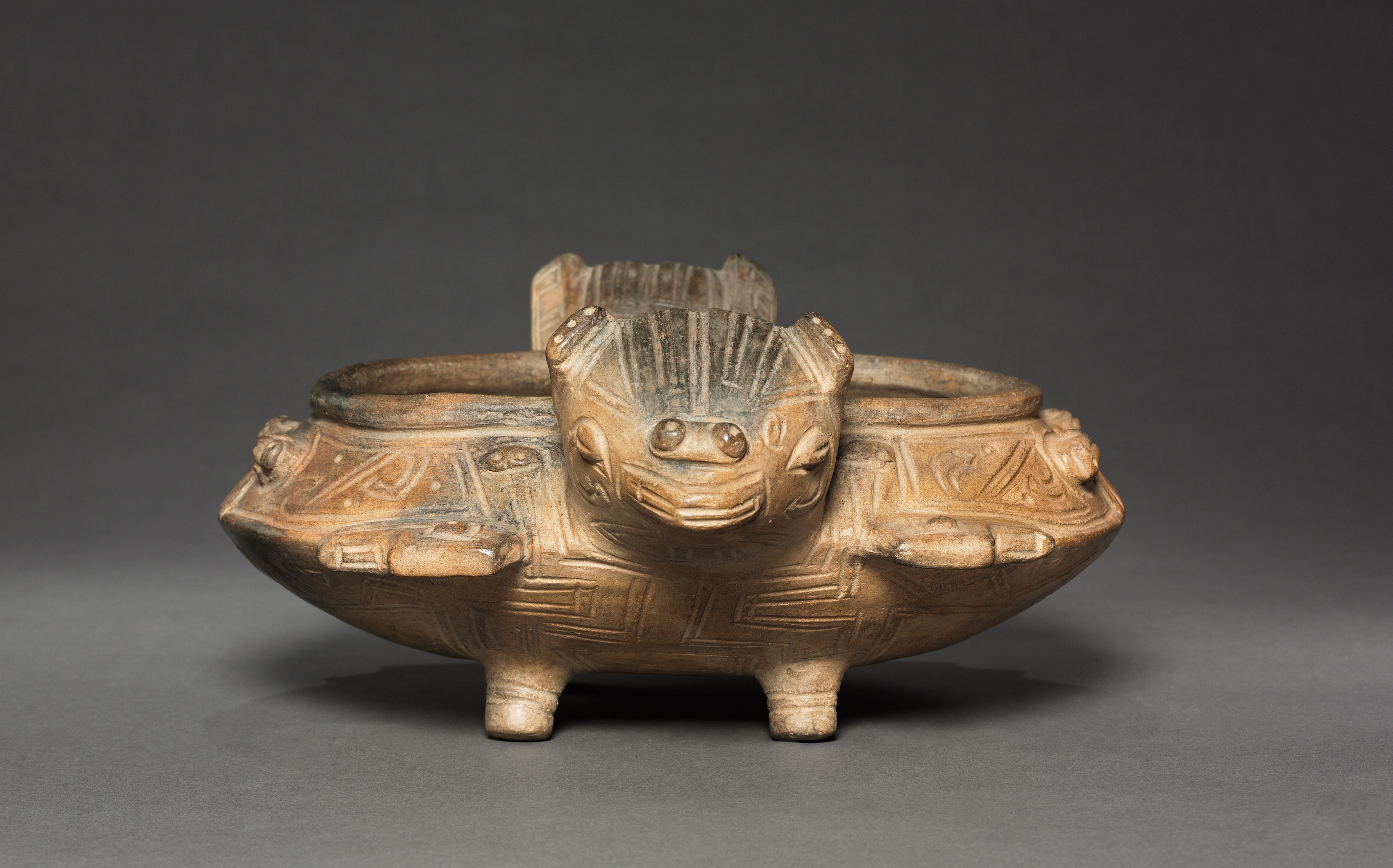 The Double-Bat Bowl, crafted by the renowned artist, showcases a distinctive ceramic piece with a predominantly brown hue and visible darker brown and black accents. The bowl features two rounded sections, resembling the shape of a bat, positioned side by side. It stands on three short legs. The exterior surface exhibits intricate carvings that include geometric patterns and stylized designs. A prominent carved figure of a bat adorns the front, characterized by large eyes and outstretched wings. The background of the image transitions from dark gray at the top to light gray at the bottom, providing a neutral contrast that highlights the bowl's details. The overall presentation emphasizes the bowl's unique craftsmanship and artistic value.