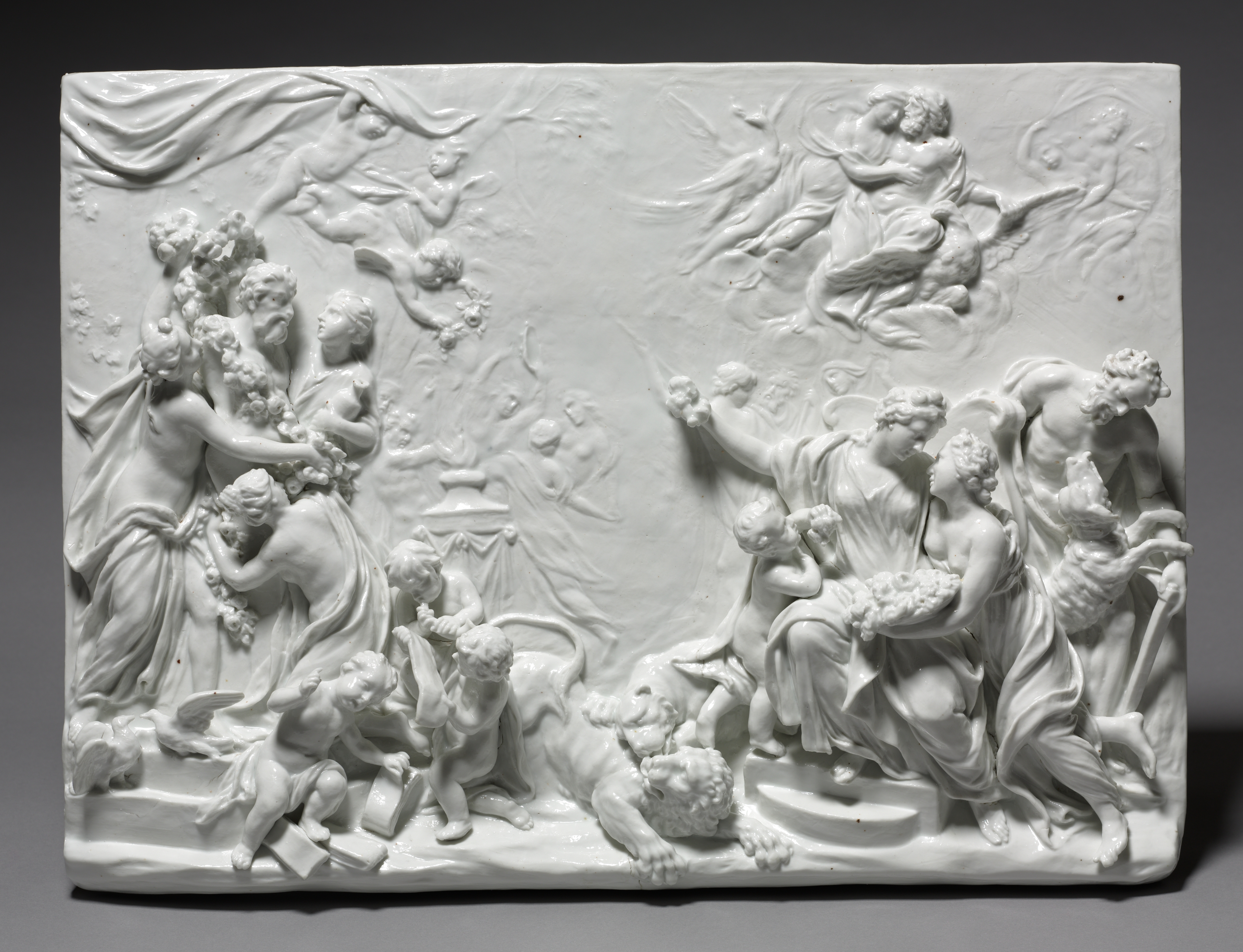 White porcelain relief plaque with a raised scene depicting multiple figures and animals. The scene features a group of people on the left side, with some standing and others sitting or lying down. A lion is present on the bottom center. On the right side, a seated figure with a child and another figure with outstretched arm are visible. A man riding a winged horse or Pegasus is shown in the top center. The plaque has a glossy finish and appears to be rectangular in shape. The background of the image is dark gray. Title: Spring. Artist: Doccia Porcelain Factory.