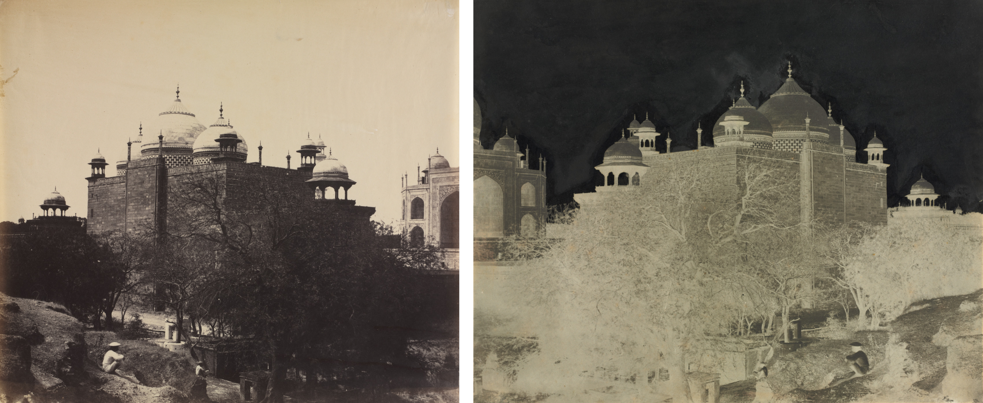 Black and white photo of the back of a large domed building. A person walks below it on a path. Trees in front of and beside the building. The photo on the left has a light background; the identical photo on the right has a dark background.
