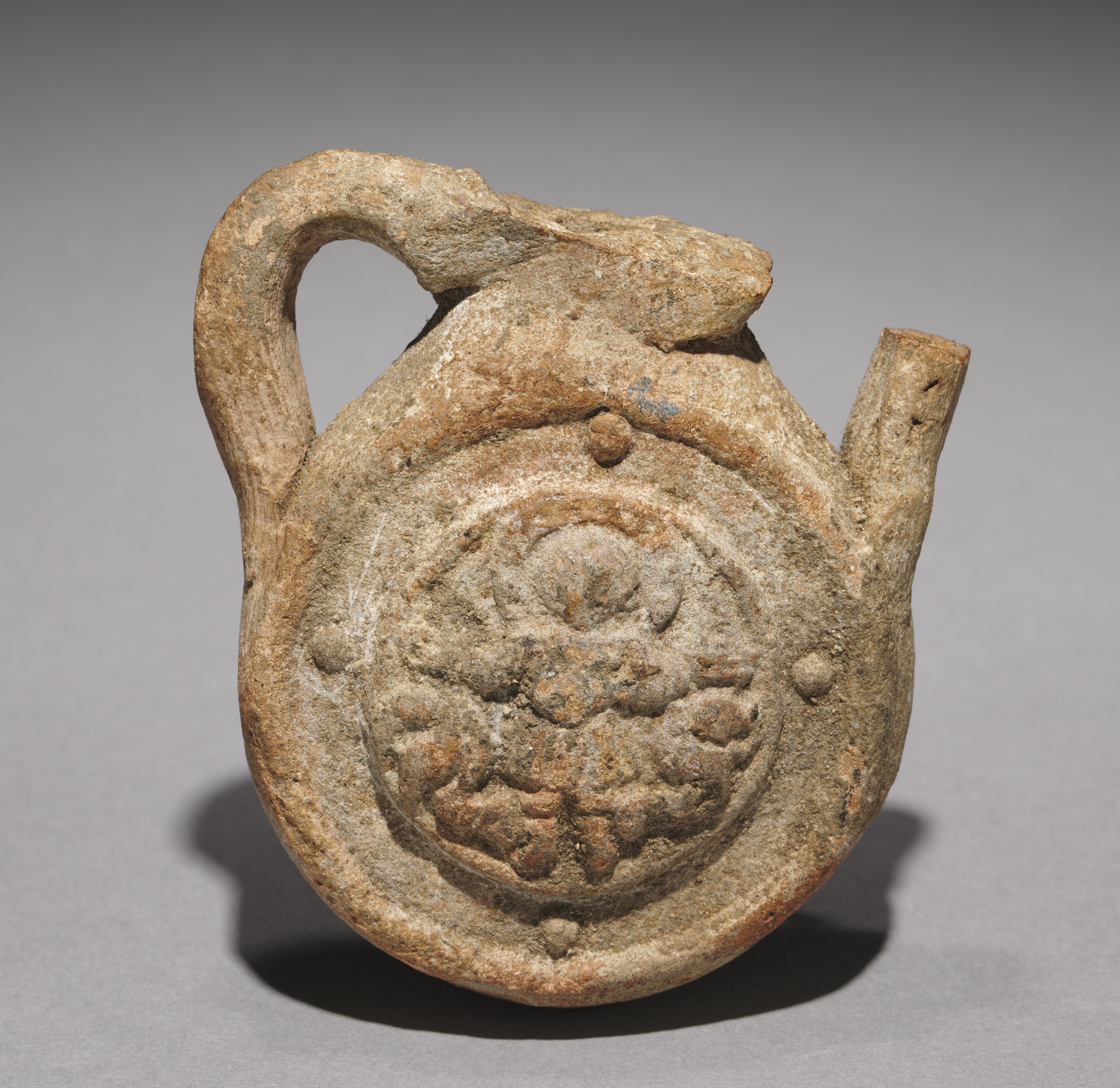 The image shows a small, weathered clay flask with a handle and spout. The flask has a circular body with a raised design on the front. The design appears to be a figure with a halo or a head surrounded by other figures or objects. The flask is made of a light-colored clay and has a rough texture. The handle is curved and attached to the top of the flask. The spout is short. The background of the image is a plain gray color, which helps to highlight the details of the flask. The title of the image is "Pilgrim's Flask with Saint Menas".