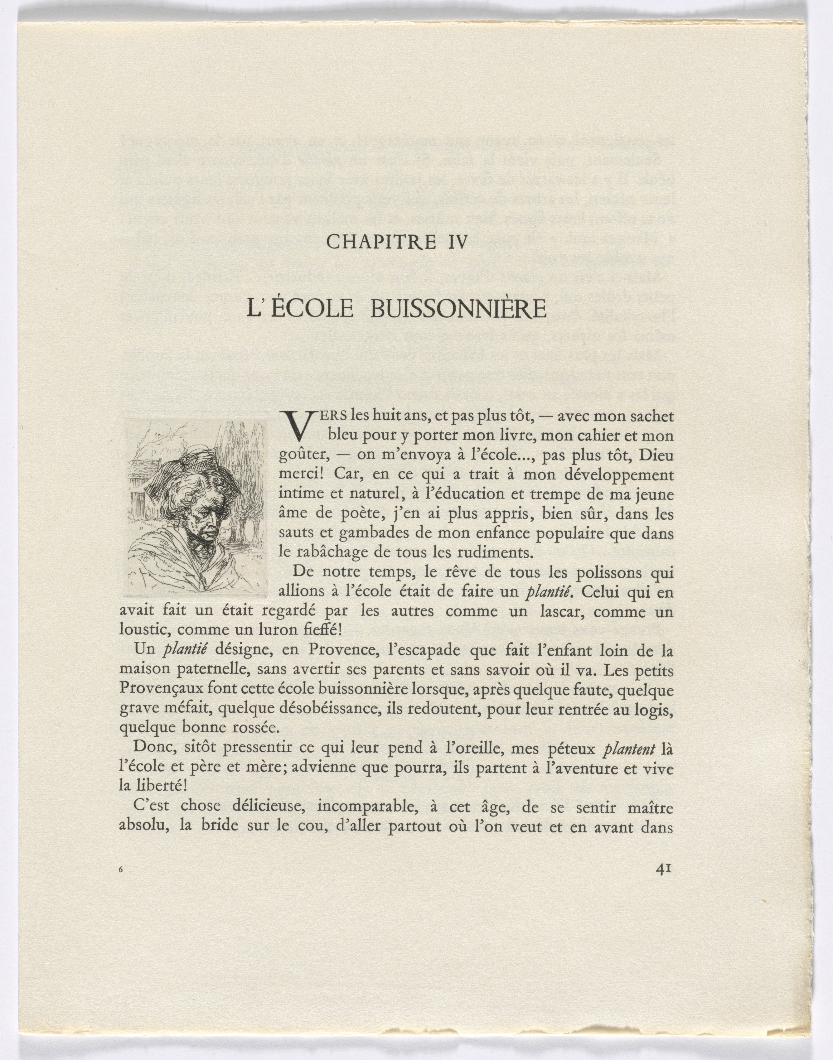A page from a book. The page is yellowed. The page has a drawing of a woman's head and shoulders on the left side. The woman has curly hair. The text is in French. The title at the top of the page reads "CHAPITRE IV" and below that "L'ÉCOLE BUISSONNIÈRE". The page number 41 is in the bottom right corner. The text is in two columns. The left column has a drawing. The right column has several paragraphs of text. A small illustration of a woman's bust.