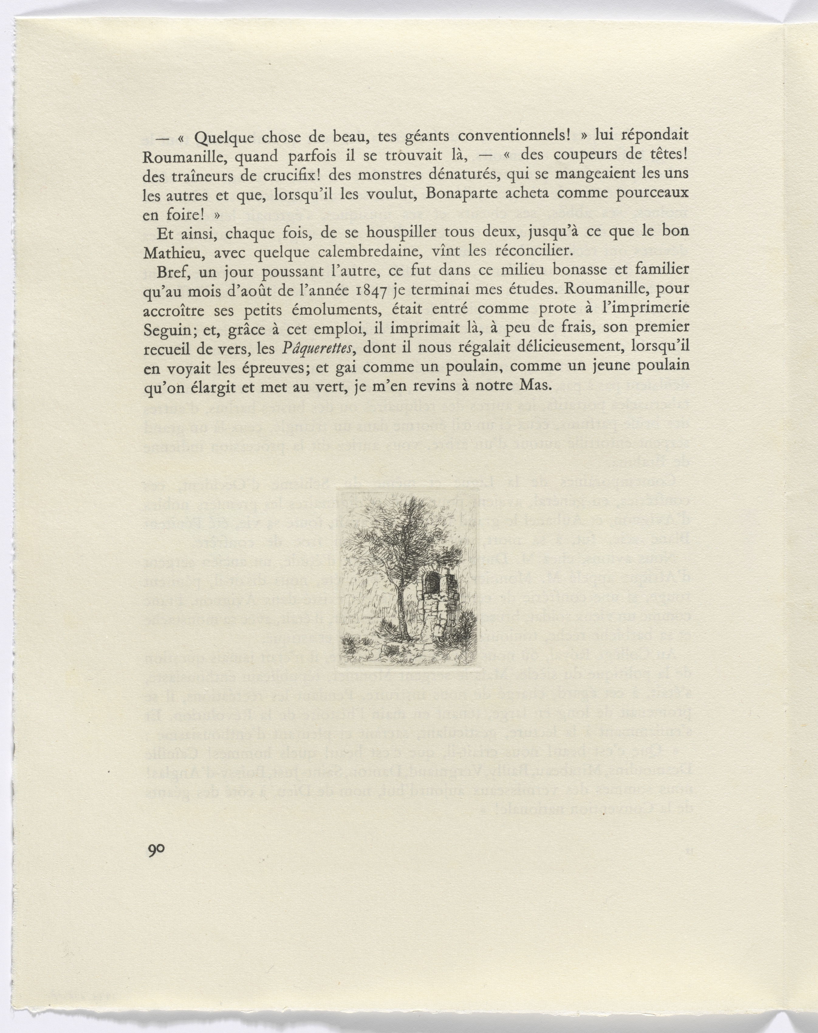 Page 90 of a book with French text, a black and white illustration of a tree and a building in the center, and a beige background. The illustration depicts a tree with foliage on the left side and a building with an arched window on the right side, surrounded by foliage and brush. The text is written in black ink and appears to be a passage from a literary work. The page number "90" is printed in the bottom-left corner.