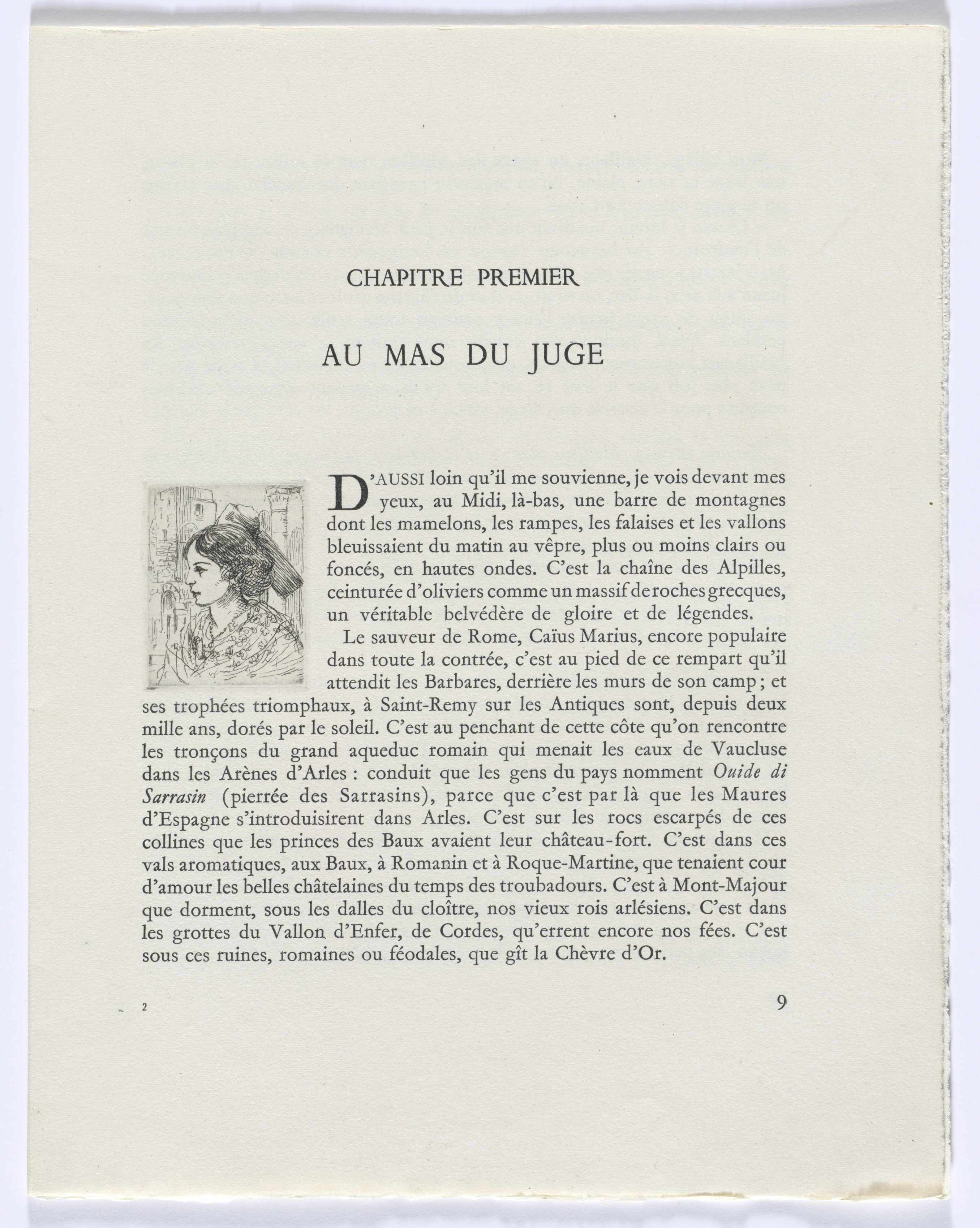 Book page with off-white or yellowed paper, rough edges. Black text in French. Top of page reads "CHAPITRE PREMIER" centered, smaller text, then "AU MAS DU JUGE" centered, larger text. Illustration on left of a woman's bust in profile with long hair. Right side of page has several paragraphs of text. Page number "9" at bottom right.