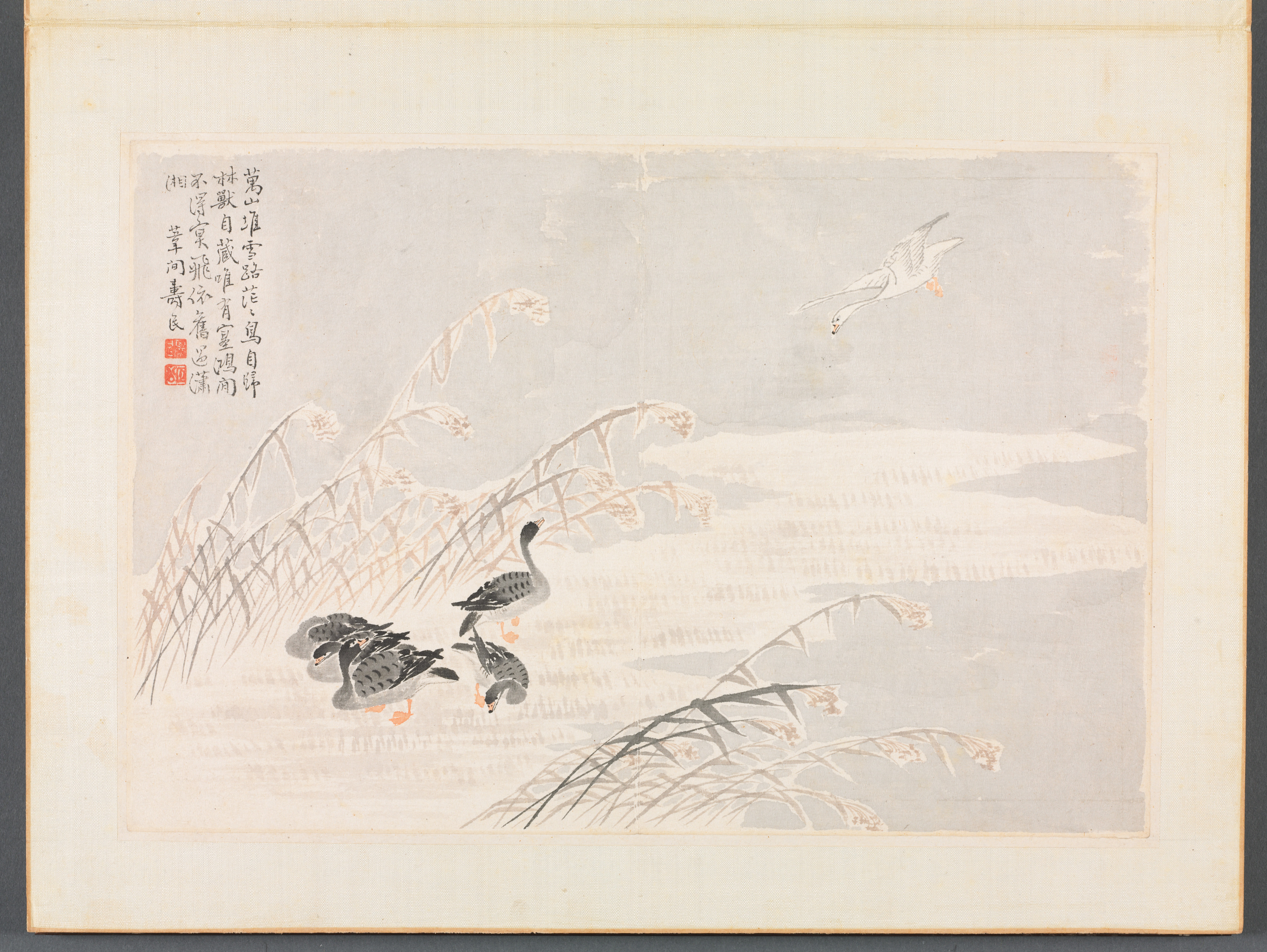 Album of Calligraphy and Paintings by Bian Shoumin. A painting depicts three ducks near water and plants on a gray background. The ducks are on the left side. Two ducks are standing and one is flying above. The standing ducks face right. They have black and white feathers with orange legs and beaks. The flying duck faces left and has white feathers with black tips on the wings and tail. The water appears calm on the right side. Reeds and plants with flower buds are on the left and bottom center. The image includes black calligraphy and two red stamps on the top left. The artwork has a yellow border around it.