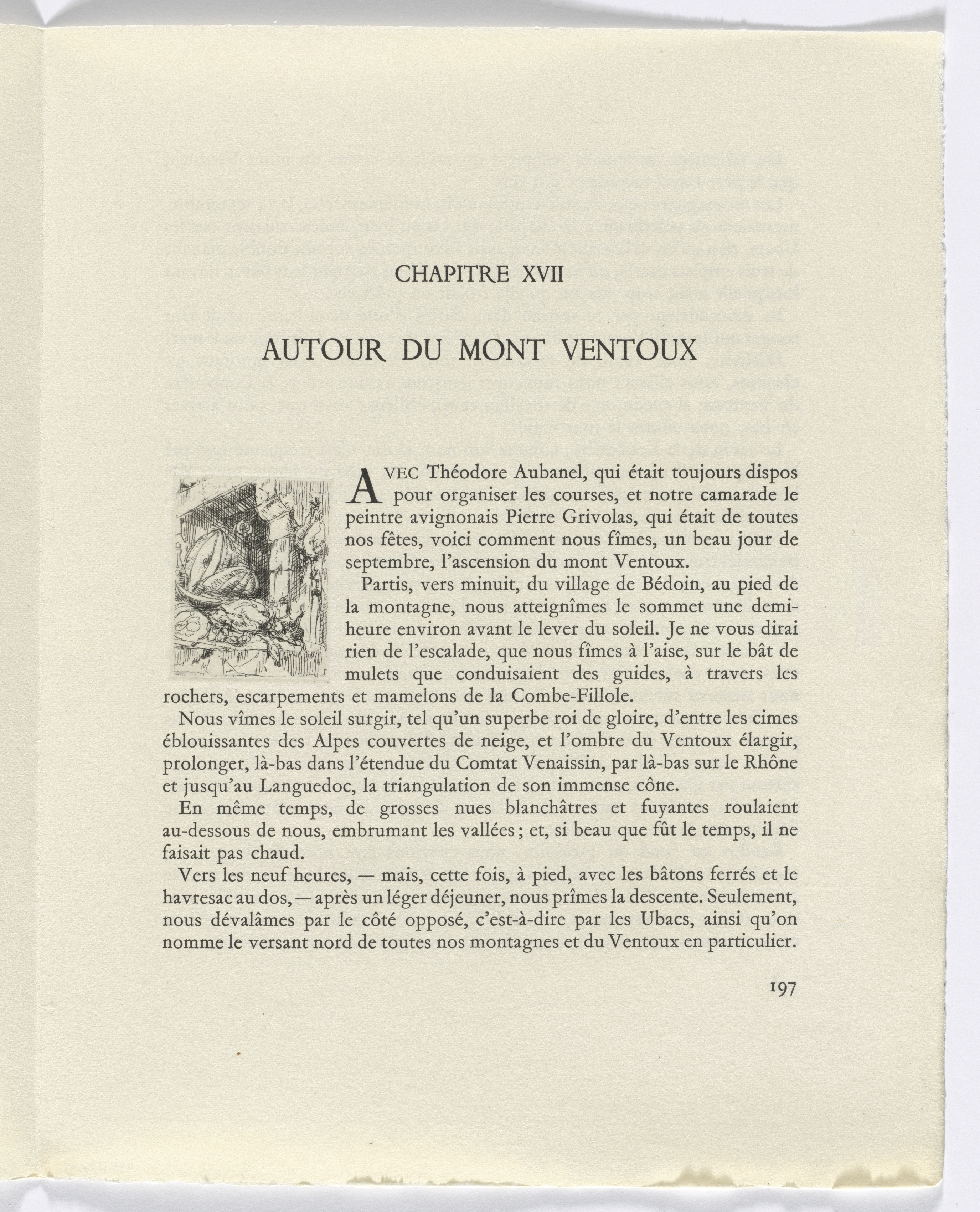 The image shows a page from a book. The page is off-white and has a rough texture. At the top of the page, "CHAPITRE XVII" is written in small black text. Below that, the title "AUTOUR DU MONT VENTOUX" is written in larger black text. On the left side of the page, there is a small black and white illustration. The illustration depicts a man sitting on a rocky outcropping, wearing a hat and holding a walking stick. He appears to be looking out at a mountain. The rest of the page is filled with black text written in French. The text is arranged in paragraphs and appears to be a passage from the book. At the bottom of the page, the number "197" is written in small black text.