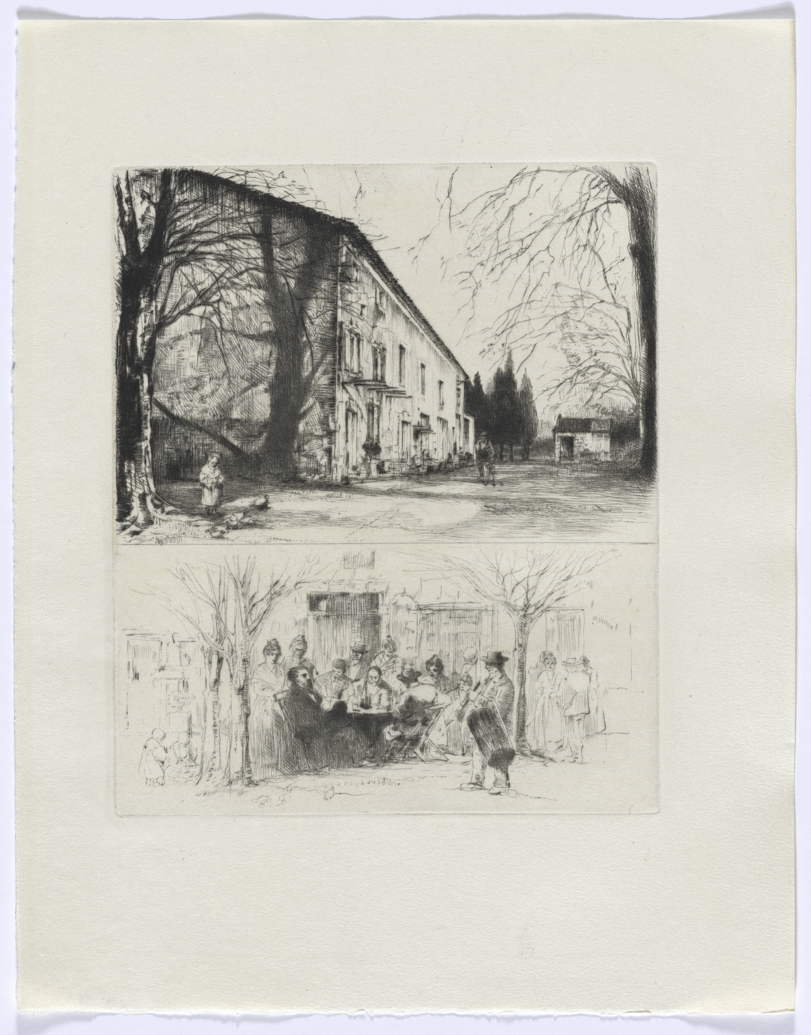 Black and white image of two scenes. The top scene depicts a street with a large building on the left and a smaller building on the right in the background. There are trees on either side of the street. People are on the street. The bottom scene depicts people sitting at an outdoor table and standing around. There are trees behind them. The image is printed on off-white paper with a rough edge at the bottom.
