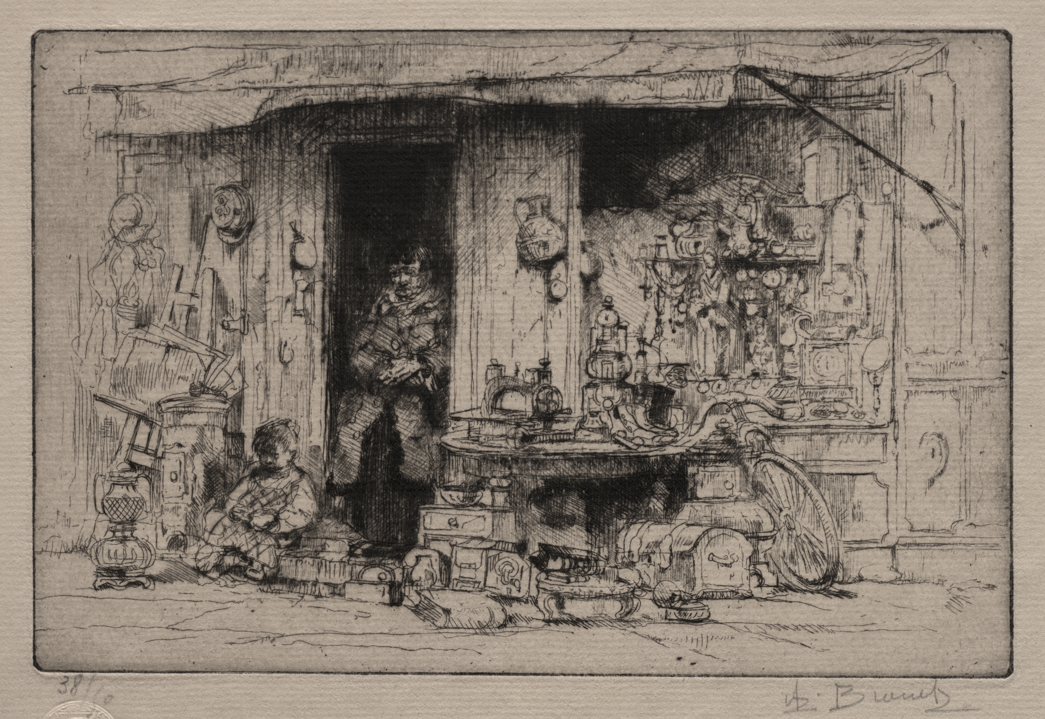 The Odds and Ends Dealer by Auguste Brouet: Black and white sketch on light brown background, rectangular with darker border around edges, a man and a small child in a shop filled with various items. The shop's awning is supported by a pole on the right, sloping down to the right. The man in a doorway on the left wears a hat and a scarf. The child sits on the ground to the left. The shop contains shelves and a table with many items, including vases, pots, clocks, and lamps. Various items hang on the walls, and some lie on the ground. The artist's signature appears in the bottom right corner.