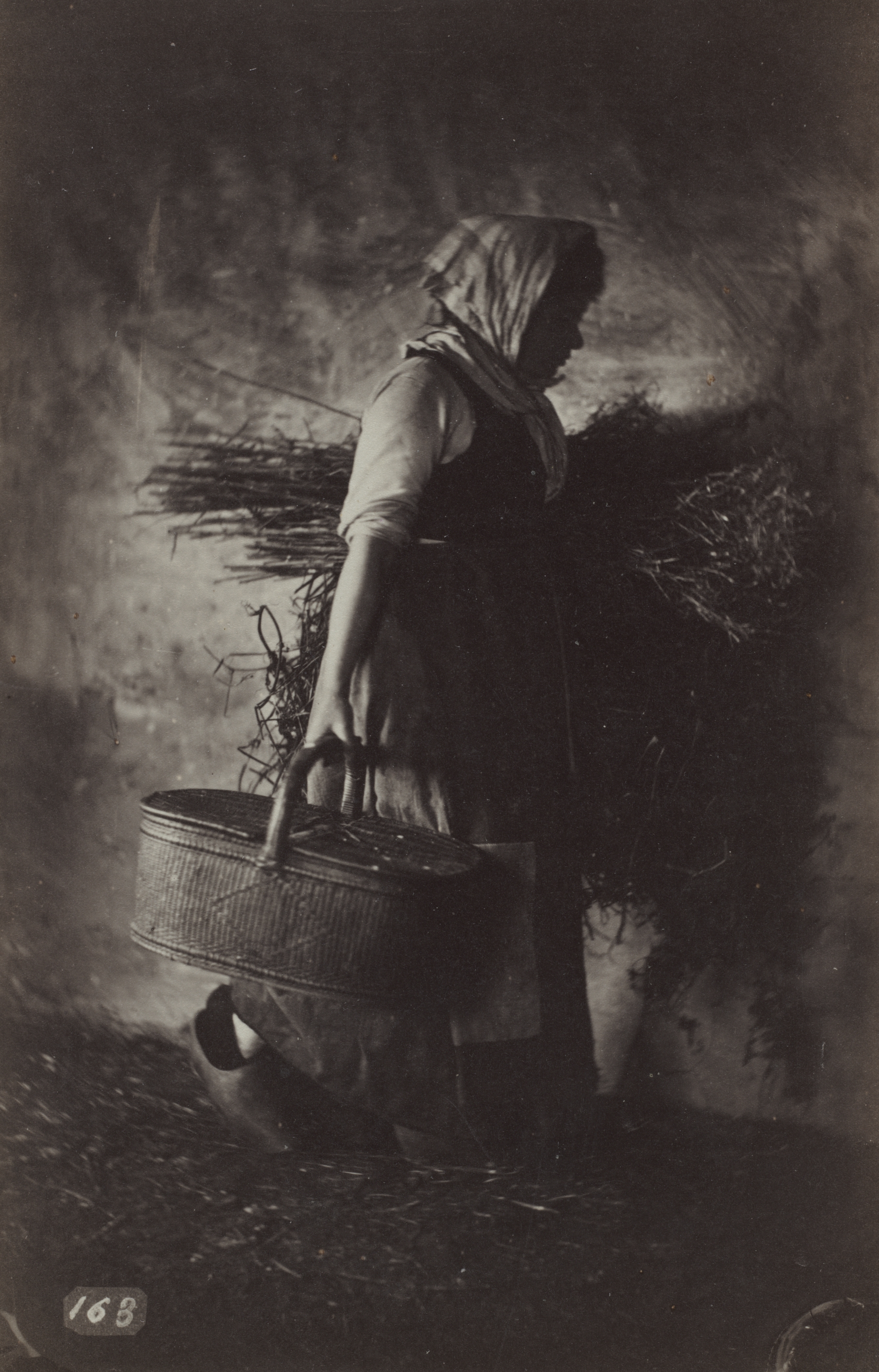 Black and white photograph of a woman wearing a headscarf and dress, carrying a large basket in her right hand and a bundle of hay or straw on her back. The woman is viewed from the side, her body facing right. She has her right arm extended downward, gripping the handle of the basket. The basket is large and rectangular with a handle. The bundle on her back appears to be made of dried plants or grasses. The background is dark and blurry, with some lighter areas that may be smoke or fog. A small number "168" is visible in the bottom-left corner.