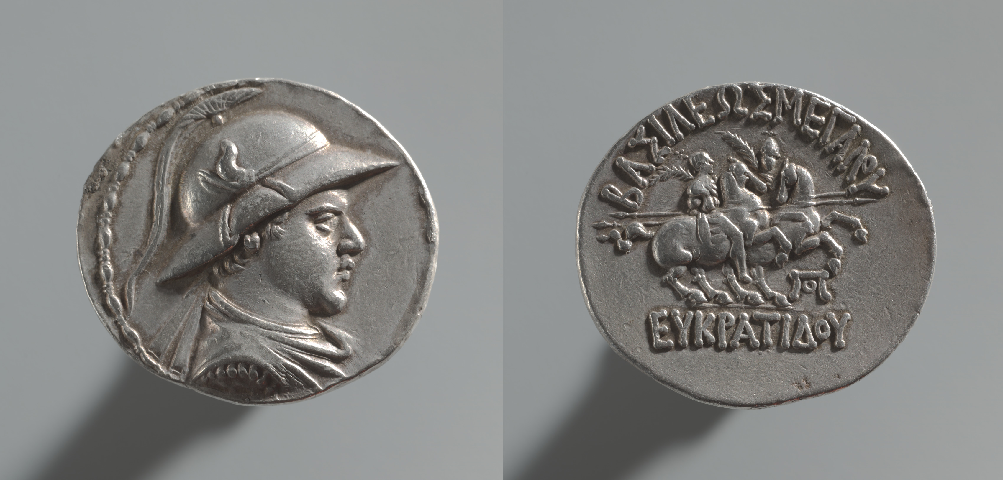 The Coin of Eukratides I shows two sides of a silver coin. The left side features a profile view of a man's head facing right, wearing a helmet with a brim and a crest on top. The helmet has a strap under the chin. The man's hair is visible under the helmet, and he wears a tunic or cloak with folds visible at the neck. The right side displays a man on horseback, riding right, holding a spear or lance in his right hand. He wears a tunic and possibly a cape flowing behind him. The horse has a saddle and appears to be rearing up. Above the rider, Greek text reads "ΒΑΣΙΛΕΩΣ ΜΕΓΑΛΟΥ" and below the rider, it reads "ΕΥΚΡΑΤΙΔΟΥ". The coin has a raised edge with a decorative border around both sides.