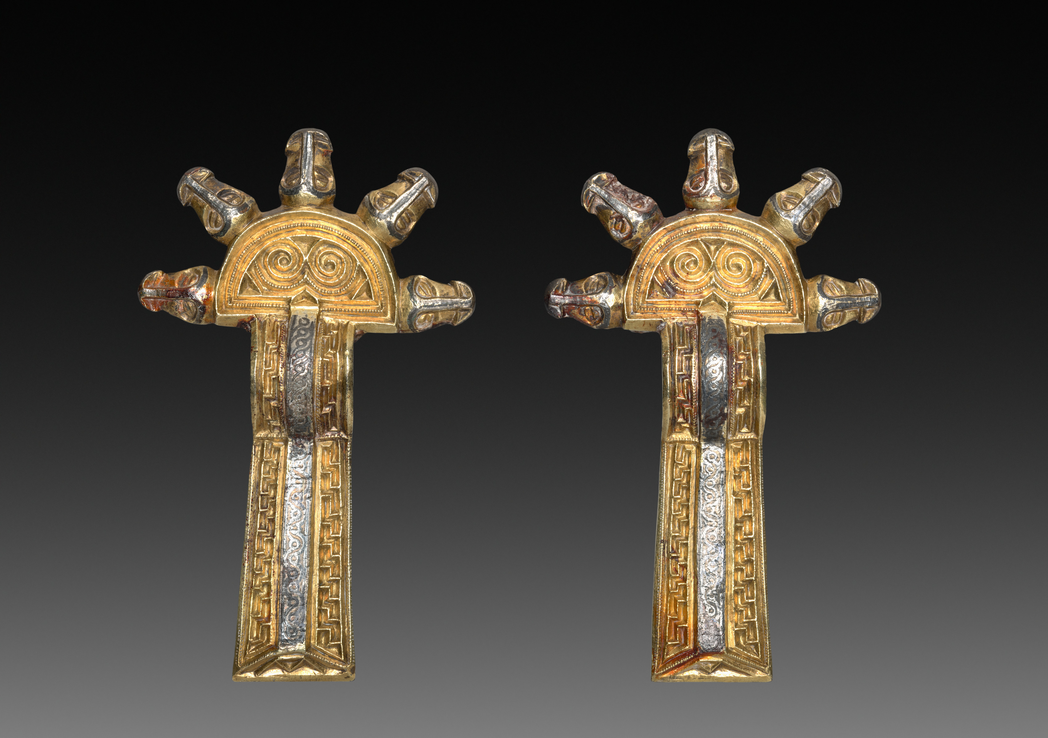 Two gold-colored metal objects, possibly brooches or fibulae, with a similar design. The objects have a long, narrow, rectangular base with a semicircular top. The semicircular top has two spiral designs on it. There are six protrusions extending from the semicircular top, resembling animal heads or other shapes. The rectangular base features a central silver-colored inlay flanked by gold-colored decorative patterns. The background is dark at the top, gradually transitioning to light gray at the bottom. The objects are symmetrical and identical in design. They appear to be made of metal, likely gold or a gold alloy. The overall design suggests an ornate and decorative piece. The objects are presented side by side.