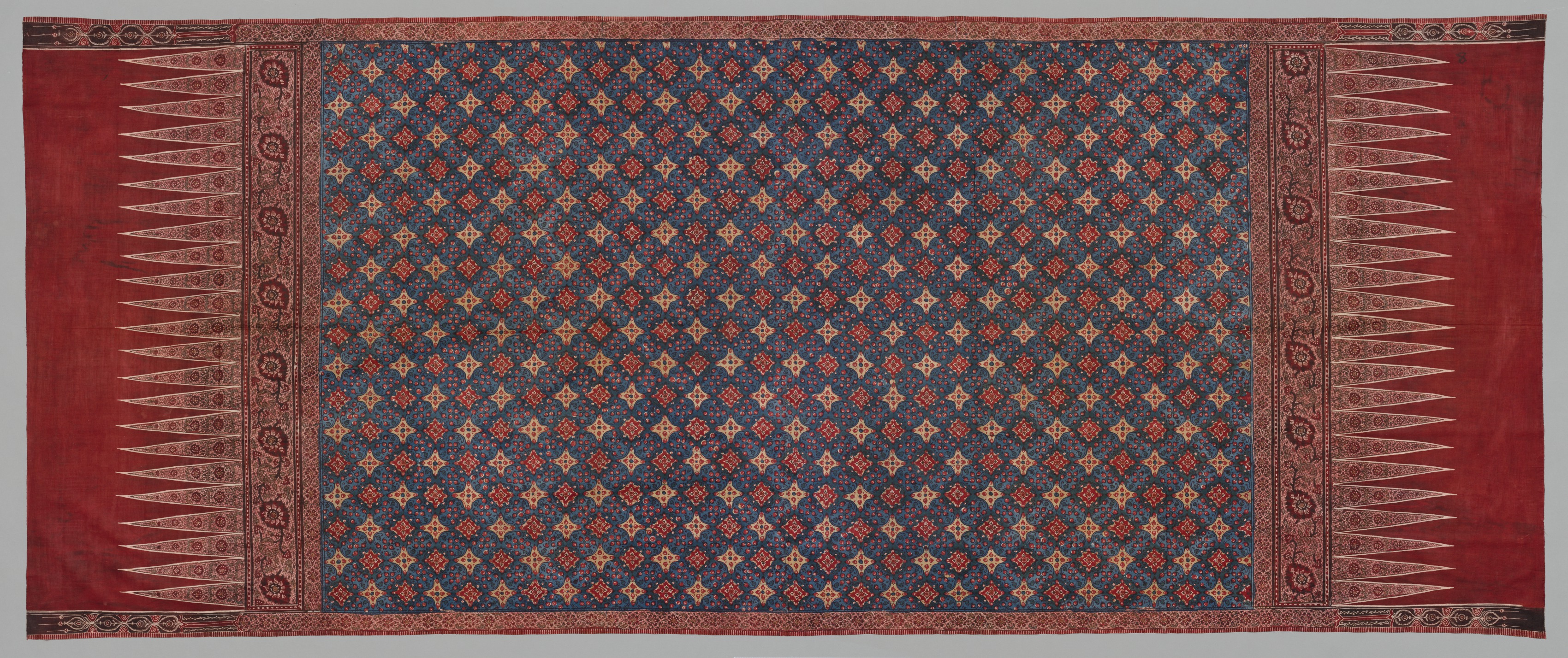 The image displays the artwork "Hip Wrapper (tapis)" by an unknown artist. The tapestry features a predominantly rectangular shape with a central section and borders. The central section is blue with rows of repeating red, orange, and yellow diamond-shaped motifs. The outer border on the short ends is solid red with symmetrical pointed white triangular motifs; on the long sides are repeating red and white botanical motifs. The border around the blue center section features a repeating pattern with red and white.